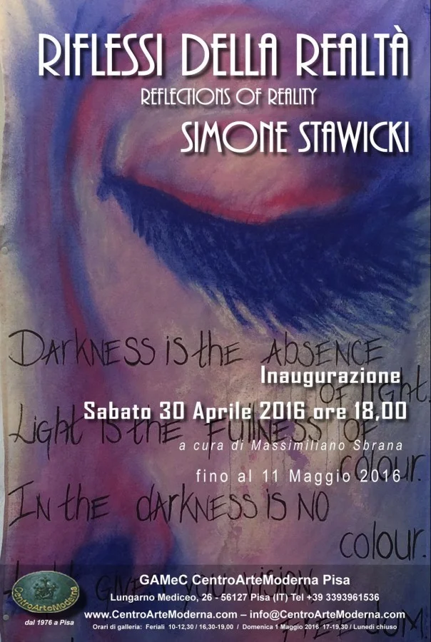 Simone Stawicki / Riflessi della Realtà _______________________________ dal 30 Aprile al 11 Maggio 2016 Inaugurazione Sabato 30 Aprile 2016 ore 18,00 Promosso da GAMeC CentroArteModerna PISA Sede espositiva: GAMeC CentroArteModerna, Lungarno Mediceo n.26 Pisa www.centroartemoderna.com , email: mostre@centroartemoderna.com, telefono +39 3393961536 a cura di Massimiliano Sbrana Artista presente : Simone Stawicki (Olanda) __________________________________ Simone Stawicki / Riflessi della Realtà Si inaugurerà Sabato 30 Aprile 2016 ore 18,00 presso il GAMeC CentroArteModerna di Pisa (Lungarno Mediceo n.26), la mostra personale dell'artista olandese Simone Stawicki, a cura di Massimiliano Sbrana, "/ Riflessi della Realtà" anteprima internazionale della sua ultima produzione artistica-creativa. La mostra ‘Riflessi della Realtà’ vi condurrà nel regno poetico del pensiero dell’artista Simone Stawicki. Stawicki vive e lavora nei Paesi Bassi e, da vera artista, ha una visione del tutto personale dell’uomo e della società. L’artista assorbe tutto ciò che osserva, come una spugna, per poi restituire la visione nei suoi lavori. Nascono così delle opere dense di colore e dalla visione ben delineata. Le creazioni di Stawicki sono caratterizzate dall’intenso cromatismo, dalle pennellate vivide e dall’unione tra oggetto e spazio. È in tale maniera che lei intende trasmettere il suo messaggio. Stawicki vede le sue opere come un linguaggio capace di instaurare una conversazione intima e privata con chi le osserva. A tale fine pondera ogni singola pennellata, ogni tratto e ogni colore perché contribuiscano a esprimere quello che intende dire. Tutto è poesia. Una pittura che è immagine fatta poesia, un riflesso della realtà. La poesia rappresenta la realtà in maniera tale da rendercela comprensibile, oppure ci offre una visione alternativa della realtà. Nell’installazione ‘Riflessioni’, le donne ritratte con sovrapposti i testi di Stawicki danno corpo ai pensieri scritti dall’artista. Altri lavori si basano sul paesaggio olandese, da secoli soggetto d’elezione per gli artisti. La famosa luce e il silenzio dell’acqua olandese donano all’uomo il tempo di entrare in uno stato d’estasi. Anche Stawicki ne subisce il fascino, assieme a quello che prova per i giuncheti: simbolo per lei di forza, orgoglio e tenerezza. L’esposizione include le opere ispirate al “Cantico dei Cantici” biblico. Nell’arte di Stawicki la rappresentazione dell’amore passionale tra uomo e donna diventa l’amore tra persone di diverse culture. Il tema affascina da tempo l’artista, che, oltre ad essere di padre polacco e madre olandese, è a sua volta sposata con un uomo indonesiano. Una mostra da vedere con molta calma per potersi assentare dal mondo ed entrare del reame del pensiero di Stawicki. Se si riesce a vedere il pensiero di Simone Stawicki, si riesce a udirne la voce dell’anima. L’arte è visione. A un pensiero astratto viene data forma, colore. L’astrazione del pensiero diventa ora un’immagine. L’immagine acquista espressività tramite le mie mani, che traducono quello che voglio dire. Questo è il mio linguaggio. Ascolta il silenzio per vedere quello ho da dire. Altre informazioni disponibili al più presto sul sito: www.Centroartemoderna.com o www.simonestawicki.com ; Per appuntamenti tel +39 3393961536 o email: mostre@centroartemoderna.com La mostra proseguirà fino al 11 Maggio 2016. (ingresso libero). Orari: 10-12,30/16,30-19,00 (feriali); Apertura straordinaria Domenica 1 Maggio 2016 17,00-19,30 (festivi telefonare) ; chiuso lunedì. Ufficio stampa: Massimiliano Sbrana mobile +39 3393961536 e-mail mostre@centroartemoderna.com