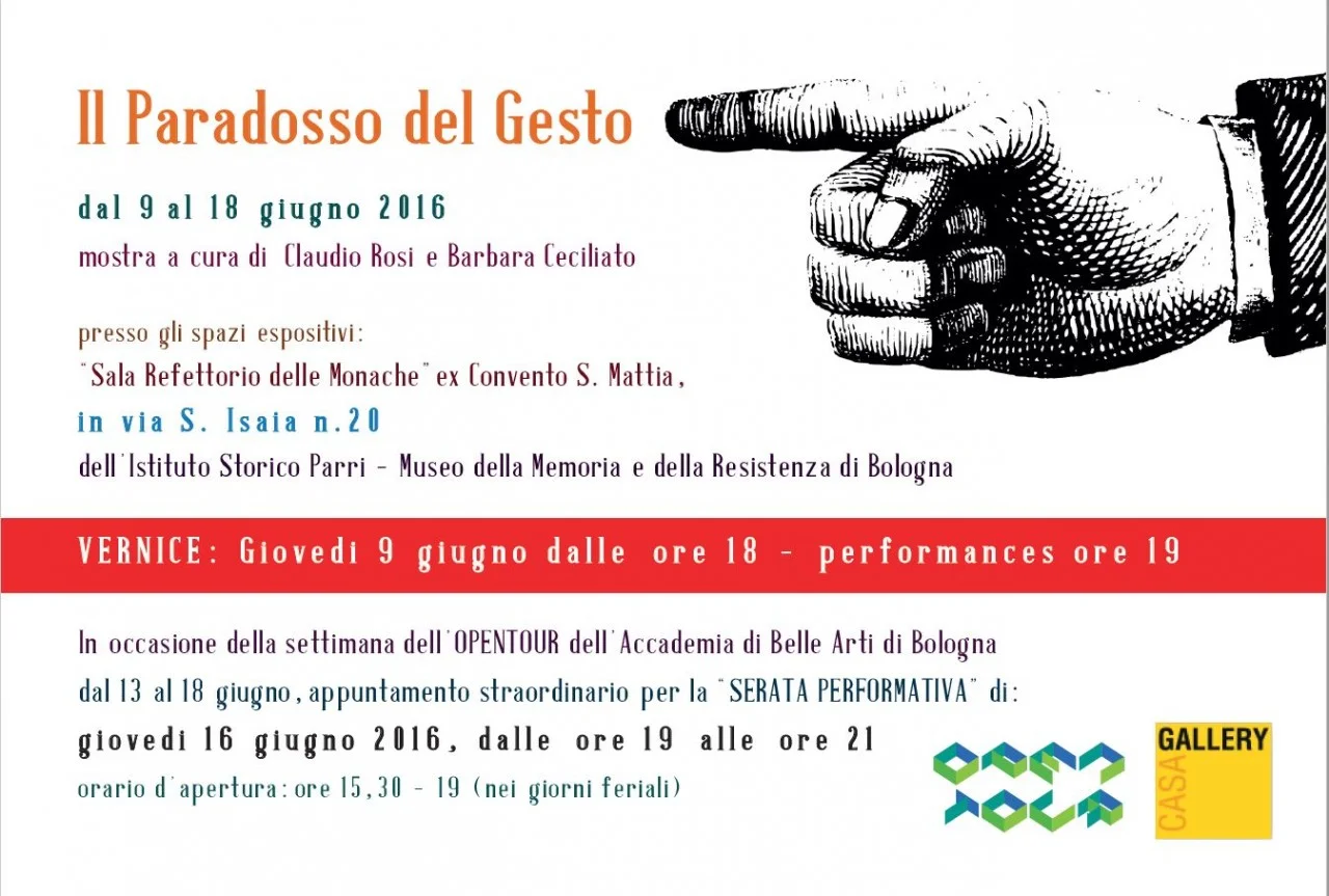 L’esposizione, "IL PARADOSSO DEL GESTO”, programmata in collaborazione con Casagallery Itinerante e con la Direzione dell'Istituto Storico Parri-Museo della Resistenza di Bologna, realizza un'ampia esposizione che ha come protagonisti 18 giovani artisti, con una rilevante partecipazione di ragazzi cinesi, tutti provenienti dall’Accademia di Bologna. Organizzata da Barbara Ceciliato, l’evento ha la regia di Claudio Rosi, che guida il numeroso gruppo di giovani, più altri “figuranti”, nella composizione e nell’allestimento dei lavori. La mostra mette in scena più spazi, si misura con più sperimentazioni artistiche: installazioni, performance, video, sculture, disegni, fotografie, interventi sonori. La performance “disegnata”, avrà rilevanza come pratica d’azione, come rappresentazione di autocontrollo, analisi e sfogo, nella modalità di tracciare segni su supporti di molteplici dimensioni e natura, in un percorso intrecciato di grafie, fantasie, ricordi, suoni e molto altro ancora.