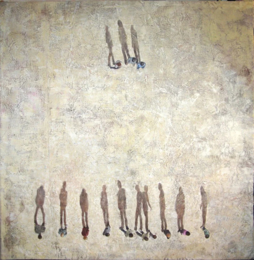 Sorge spontanea una riflessione sull’invisibile, esiste una collocazione geometrica precisa che potrebbe svelare il significato recondito dell’opera e che è stato volutamente nascosto, ed anche la volontà di contrapposizione dei due quadri esposti più grandi; una disposizione circolare ed una lineare che avvalorano le molteplici possibilità relazionali tra gli individui e che ci riconducono allo stesso isolamento proprio, solo le ombre s’incontrano in una molteplicità di rapporti e collegamenti. Viene interpretata la definizione di cerchio che è il simbolo della compiutezza e dell’unione, e di linea retta che ha il significato di ordine, di parità, di schieramento; le ombre che sono in primo piano seguono l’ordinamento geometrico ma ne stravolgono il significato minimizzando l’importanza della disposizione e creando una mescolanza relazionale. Negli altri dipinti l’artista indaga l’individualità delle persone, il trittico “W 54th st.” raffigura l’andamento dei passanti in una strada di New York che camminano individualmente dove non c’è commistione e nessun rapporto, sono persone che hanno bisogni e obiettivi accompagnati dalle proprie ombre; in questo caso l’ombra è quel che di noi non può essere risolto in valore collettivo, essa indica la vera individualità e corrispondenza.