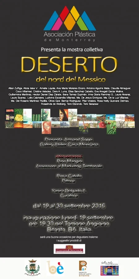 Gallery Atelier Casa Mexicana in Italia nell’ambito del progetto “Scambio di forme e colori tra il Messico e l’Italia” nato nel 2006 in una collaborazione che continua da diversi anni con il comune di Bitonto ha come obiettivo principale di favorire attraverso iniziative culturali la crescita dell’interesse a scoprire di più sul Messico e la Puglia. Il Messico è ricco non solo di arte, cultura, storia, archeologia, tradizioni, spiagge ma ci sono anche luoghi meno conosciuti altresì interessanti, suggestivi e mistici, come i deserti del nord del Messico che comprende Baja California, Sonora, Chihuahua, Coahuila, Nuevo Leon e lo stato di Tamaulipas e uniscono il Messico con il sud degli Stati Uniti. Dello stato di Nuevo Leon sono gli artisti della Asociación Plastica de Monterrey che con i loro dipinti ci vogliono fare conoscere di più questi luoghi spesso apparsi in scene di famosi film western americani. Il visitatore potrà apprezzare 28 opere dove ogni artista con il suo stile cerca di regalare un piccolo scorcio di Messico del Nord. Le opere sono di formato 30 x 40 cm realizzate con diverse tecniche come olio, acrilico, acquerello ecc. Gli artisti partecipanti sono: Allan Zuñiga, Alicia Islas V., Amelia Loyola, Ana Maria Morales Elcoro, Antonio Aguirre Mata, Claudia Almaguer, Coco Villarreal, Cristina Valadez, Dora A. Luna, Elisa Sanchez Cabello, Eva Anagali Garza Molina, Guillermina Martinez T., Hector Daniel Diaz Zàrate, Iliana Tamez Guzmàn, Irma Gloria Ramìrez G., Laura Alvarez, Laura Suarez, Lolis Cabriales, Ludivina Escamilla Villareal, Ma. De Jesus Enriquez, Ma. De la Luz Villareal, Ma. Del Rosario Martinez Padilla, Olivia Gpe. Bernal Rodriguez, Pilar Vidales, Rosa Nelly Guevara Delmas, Rosalinda de Wolberg, Tere Elizondo, Tere Salazaar. L’inaugurazione avverrà lunedì 19 settembre 2016 ore 19.30 all’interno del Torrione Angioino di Bitonto (BA) Italia. Introduce Armand Soppi di Gallery Atelier Casa Mexicana, Yanira Delgado curatrice della mostra Interverrà l’assessore al Marketing Territoriale Rino Mangini e la pittrice Rosa Catello. La mostra si potrà visitare dal 19 al 30 settembre 2016 la mattina 9:30–13:30 la sera: lun. mar. mer. gio. dom. 16:30–20:30 ven. sab. 16:00–22:00 L’ingresso è libero. Info +39 345 2222464