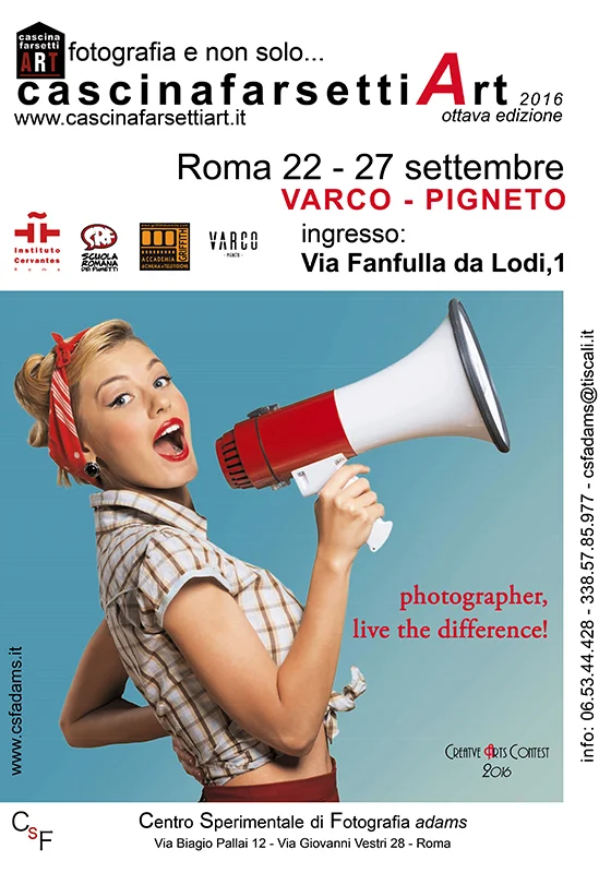 22 - 27 settembre 2016 Roma Via Fanfulla da Lodi 1 - VARCO - PIGNETO inaugurazione giovedì 22 settembre ore 18,30 “Nessun limite, eccetto il cielo…” (Miguel de Cervantes 1547-1616) Il tema della presente edizione, Follia, Istinto, Sogno e Fantasia vuole essere un doveroso tributo ad una delle creazioni più alte e strabilianti della letteratura di tutti i tempi. Giunta alla ottava edizione la manifestazione cascinafarsettiArt fotografia e non solo… promossa dal Centro Sperimentale di Fotografia adams, come da tradizione vuole essere una occasione di incontro e confronto tra autori affermati ed emergenti. La presente edizione nasce in collaborazione con l’Istituto Cervantes Roma, con la Scuola Romana dei Fumetti, con l’Accademia di Cinema e Televisione Griffith. Numerose le opere e gli autori presenti. Ospite d’onore la fotografa polacca Kasia Derwinska con le sue immagini oniriche e fantastiche. Espongono: Silvia Agostini, Sara Aguzzoni, Loredana Bardas, Andrea Gandini, Filiberto Galli, Gianni Di Carlo, Mario Di Lorenzo, Roberta Marsigli, Leonardo Perri, Antonio Perrone, Souheila Soula, il piccolo Riccardo, Emanuela Rizzo, Alessio Vissani. Saranno proiettate le opere di: Gaia Adducchio, Fabio Ferri, Alessandro Fiaschetti, Danila Labia, Andrea Pellegrini, Agnese Samà, Guglielmo Romano Schiavella, Cecilia Signorini. Proiezioni Video: Franco Bianchi, Jessica Tosi. Saranno presenti le opere dei finalisti del concorso fotografico “Nessun limite eccetto il cielo…”e nel corso della manifestazione la giuria ne proclamerà il vincitore. Concorso promosso da: Creative Art Contest Saranno proiettate le opere degli studenti del Liceo Classico Statale Luciano Manara. Ogni giorno incontri, seminari, workshop. Per il programma completo e altre informazioni vai al sito http://www.cascinafarsettiart.it cascinafarsettiArt fotografia e non solo… http://www.cascinafarsettiart.it produzione: Centro Sperimentale di Fotografia adams http://www.csfadams.it