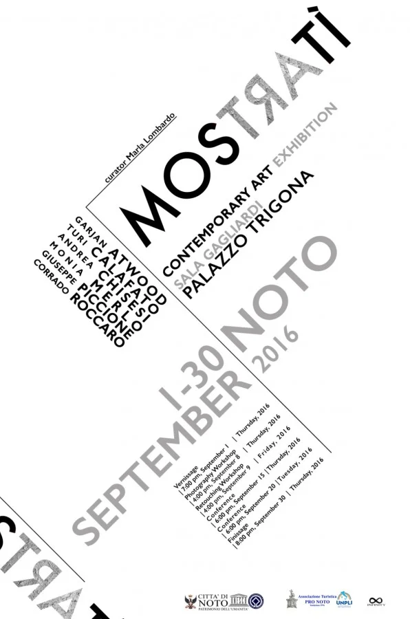 "Al genio non serve riflettere – gli basta mostrarsi." Giovanni Soriano, Maldetti, 2007 Dal 1 al 30 settembre 2016 la prestigiosa sede di Palazzo Trigona di Noto, ospiterà “Mostratì”, la mostra d’arte contemporanea a cura di Marla Lombardo, patrocinata dal Comune di Noto, promossa dall’Associazione Turistica ProNoto ed organizzata dall’Infinity Agency. L’evento è stato già inserito nel programma online e cartaceo della manifestazione “Effetto Noto” organizzata annualmente dal Comune di Noto e giunta alla sua VIˆ edizione. Gli artisti invitati ad esporre sono Garjan Atwood, Turi Calafato, Andrea Chisesi, Monia Merlo, Giuseppe Piccione, Corrado Roccaro. Mostratì presenta una serie di opere ispirate al concetto di “Ritratto”, in cui il comune denominatore attinge dall’immaginario collettivo per farsi portatore di segni, codici e valori. I lavori proposti per Mostratì sono tutti inediti e manifestano chiaramente l’intenzione degli artisti di confrontarsi col proprio vissuto, in un dialogo fatto di rimandi continui alla propria dimensione artistica, secondo un proprio linguaggio estetico-espressivo e contaminazioni socio-culturali. In questo ampio e vario contesto espositivo, in cui la fotografia torna protagonista, con tre fotografi di PhotoVogue, la mostra sarà arricchita da workshop, incontri ed eventi collaterali. I giorni 8 e 9 settembre con "Fashion Icon", Workshop di Fashion & Beauty Photography a cura di Marcello Scrofani e Slowmotion Travels in collaborazione con il designer e retoucher Marco Pasqua. Giorno 15 settembre per il ciclo "Incontri a Palazzo" si terrà l'incontro letterario con lo scrittore e giornalista Francesco A. Russo ed il fotografo siciliano noto a livello internazionale Aldo Palazzolo. Giorno 20 settembre per il ciclo "Incontri a Palazzo" si terrà l'incontro letterario con la fotografa siracusana Maria Pia Ballarino ed il docente enogastronomico e chef Giovanni Fichera. Infine, venerdì 30 settembre, il giorno del finissage della mostra, avrà luogo la sfilata del fashion designer palermitano Sergio Daricello, entrato ormai di diritto con il suo proprio Brand nel gotha della moda internazionale. Nel suo curriculum si annoverano collaborazioni e nomi come Dolce&Gabbana, Etro, Versace, Giuliano Fujiwara e la regina del pop Madonna. Catalogo online su www.mostrati2016.com Testo critico a cura di Emanuele Beluffi Mostratì 1- 30 settembre 2016 Palazzo Trigona, Noto FREE ENTRY Orario: Tutti i giorni 10:30- 14:00 e 18:30-22:00 Segreteria Organizzativa e Ufficio Stampa: Infinity Agency – Marla Lombardo 3381613713 – marla@00infinity.com