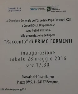 La Direzione Generale dell'Ospedale Papa Giovanni XXIII e Cropelli S.r.l. Unipersonale sono lieti di invitarla alla presentazione dell'opera "Racconto" di Primo Formenti Inaugurazione sabato 28 maggio 2016 ore 17.30 Paizzale del Quadrilatero Piazza OMS,1 - Bergamo Comunicato Stampa Dal 1997 Primo Formenti ci narra la vita, le emozioni ed i sentimenti attraverso i suoi “racconti”. Tecniche miste su tele estromesse in cui la narrazione, puramente astratta, avviene attraverso l’uso del colore. Il gioco di linee e segmenti che si incrociano quasi in maniera dimessa, lasciano spazio al colore, forma principale di espressione. L’opera presentata per l’ospedale di Bergamo si suddivide in due parti: La prima, un mosaico pavimentale che descrive l’insorgere della malattia in cui prevale il colore giallo, sfocia in uno stelo in acciaio dal forte blu che indica la via della guarigione (seconda parte). I due elementi sono legati tra di loro da una spirale rossa, simbolo usato dai guaritori di alcune tribù per togliere il male. La speranza e la forza di rialzarsi portano, così come lo stelo di Formenti, a gioire tanto da toccare il cielo per la salute riconquistata. L’opera di Primo Formenti è l’ultimo “figlio” del patrimonio artistico dell’Ospedale Papa Giovanni XXIII, che si aggiunge alle opere di Pistoletto, Garutti, Bonfanti e Pedrini. Ada Egidio