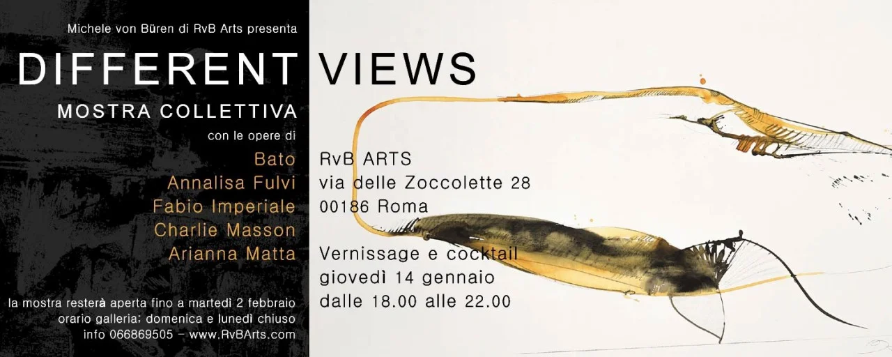 La galleria RvB Arts con la sua politica di Accessible Art inaugura a Roma in via delle Zoccolette 28 DIFFERENT VIEWS con le opere di Bato Annalisa Fulvi Fabio Imperiale Charlie Masson Arianna Matta Vernissage e cocktail: giovedì 14 gennaio 2016 dalle 18:00 alle 22:00 la mostra resterà aperta fino a martedì 2 febbraio orario negozio; domenica e lunedì chiuso Curatrice e organizzazione: Michele von Büren RvB Arts - Via delle Zoccolette 28, 00186 Roma info 06.6869505 / 335 1633518 www.rvbarts.com DIFFERENT VIEWS è una mostra che presenta i punti di vista di cinque artisti ognuno dei quali ci porta nel proprio mondo per farci scoprire nuovi e particolari percorsi del vedere. Dalle percezioni istantanee, essenziali e ironiche catturate dall'acuta sensibilità di Bato si passa alle ambientazioni materiche di Arianna Matta dove luoghi abbandonati sono attraversati da un flusso spazio temporale che tutto compenetra e disgrega. Sotto l'azione dello sguardo dell'artista americano Charlie Masson il paesaggio si trasforma in miraggio per dar vita a palpitanti vedute rurali e urbane. Futuristiche e irrazionali sono invece le trasformazioni urbane di Annalisa Fulvi, cantieri in cui le strutture architettoniche dovranno adeguarsi a sempre nuove esigenze, per arrivare alle psicogeografie di Fabio Imperiale dove la città e il corpo interagiscono come unico organismo. RvB Arts è una galleria romana che promuove l'Accessible Art. Scova talenti emergenti e organizza mostre ed eventi con lo scopo di far conoscere l'arte contemporanea in maniera divertente ed informale, rendendola anche 'abbordabile' da un punto di vista economico. Michele von Büren: gallerista di RvB Arts; www.rvbarts.com - info@rvbarts.com Viviana Quattrini: critica d'arte della galleria; vivianart82@gmail.com Ufficio stampa: Caterina Falomo; tel 346.8513723; caterina@pennarossapresslab.it