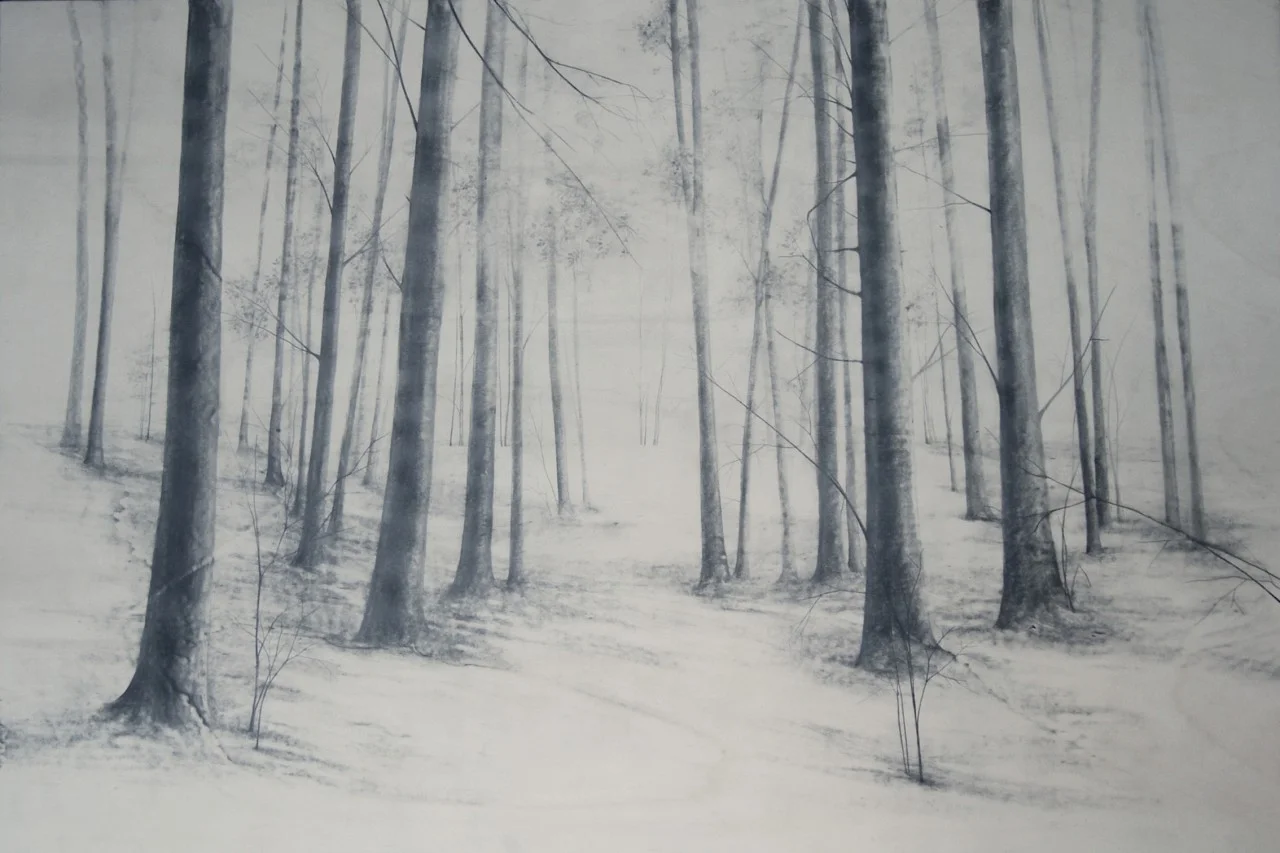 E’ da quando ha iniziato a dipingere che JERNEJ FORBICI ci fa partecipi – con la sua pittura potente, pastosa, intrisa di echi antichi – delle devastazioni perpetrate in Slovenia dalle fabbriche di alluminio, eppure ciò che domina su quelle tele grandi, ipnotiche, è un senso di grazia, di pace regalata, che si concretizza negli sfondi dalla suggestione rinascimentale. E il dialogo diventa un canto malinconico nei delicati lavori a grafite su legno di MARIKA VICARI: distese di alberi spogli che si allungano all’infinito, prati dormienti sotto la coltre leggera della neve, rami vibranti nella brezza profumata di muschio.