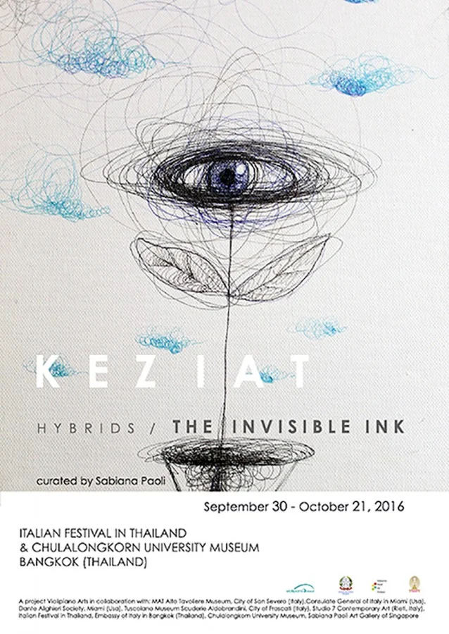 In occasione della Festa Italiana a Bangkok (Thailandia) si conclude il ciclo di mostre Hybrids dell'artista Keziat, inaugurato per la prima volta lo scorso febbraio al Mat Museo Alto Tavoliere di San Severo, esposto oltreoceano per la seconda tappa americana (Società Dante Alighieri di Miami) e, nuovamente in Italia in mostra nel bellissimo spazio espositivo del Museo Tuscolano Scuderie Aldobrandini di Frascati (Roma), Hybrids si appresta a essere presentato e accolto in un’ultima tappa estera. La mostra dal titolo “The invisible ink” a cura di Sabiana Paoli, inaugura presso il Chulalongkorn University Museum, dal 30 settembre al 21 ottobre 2016. L’esposizione è inserita nel programma del prestigioso festival italiano organizzato dall’Ambasciata d’Italia a Bangkok; manifestazione di prestigio che porta ogni anno i migliori artisti italiani in Thailandia. Hybrids, secondo ciclo espositivo internazionale di Keziat segue quello del 2012-2014 intitolato Visionaria, con mostre al MAT, Museo dell’Alto Tavoliere di San Severo (Foggia), Casa Italiana Zerilli-Marimò di New York, Centro Culturale Elsa Morante di Roma, Sabiana Paoli Art Gallery di Singapore e all’Istituto Italiano di Cultura di Amsterdam.