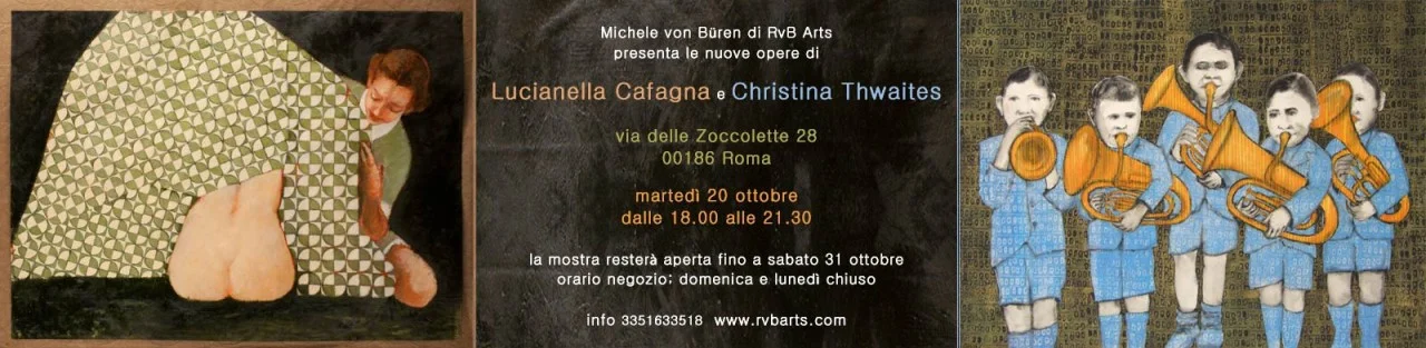 La galleria RvB Arts inaugura a Roma le mostre personali di Lucianella Cafagna e Christina Thwaites martedì 20 ottobre 2015 dalle 18:00 alle 22:00 la mostra resterà aperta fino a sabato 31 ottobre orario negozio; domenica e lunedì chiuso Curatrice e organizzazione: Michele von Büren RvB Arts - Via delle Zoccolette 28, 00186 Roma Lucianella Cafagna è nata a Roma nel 1968. Ha studiato all'École Nationale Supérieure des Beaux-Arts di Parigi e ha passato un periodo d'apprendistato nello studio di Pierre Carron, pupillo di Balthus. Nel 2011 ha partecipato alla 54˚ Esposizione Internazionale d'Arte della Biennale a Venezia, con un'opera selezionata per il Padiglione Italia. Il mondo dell'infanzia è un tema ricorrente nel lavoro della Cafagna, che unisce l'eleganza formale dello studio tradizionale con uno slancio nel mondo contemporaneo. I critici d'arte hanno messo in risalto la sua abilità nel creare un senso di sospensione senza tempo, i suoi soggetti posti tra la memoria e l'oblio come emblema struggente della nostra sfuggevolezza. Christina Thwaites, nata a Sheffield in Inghilterra nel 1980, dopo essersi laureata ad Edimburgo nel 2004 ha avuto diverse esperienze di lavoro tra Amsterdam, Roma, Palestina, Australia e America, dove attualmente vive. I suoi lavori più recenti sono stati esposti a Sydney, Canberra e Melbourne e in due mostre collettive a Roma nelle prestigiose sedi di Palazzo delle Esposizioni e del MACRO. RvB Arts presenta per la prima volta le opere che la Thwaites ha creato durante il suo recente soggiorno in Australia. Questo lavoro è frutto di una sua ricerca approfondita sulla situazione degli aborigeni e della loro identità 'rubata'. RvB Arts è una galleria romana che promuove l'Accessible Art. Scova talenti emergenti e organizza mostre ed eventi con lo scopo di far conoscere l'arte contemporanea in maniera divertente ed informale, rendendola anche 'abbordabile' da un punto di vista economico. Michele von Büren: gallerista di RvB Arts; www.rvbarts.com - info@rvbarts.com - 335 1633518 Ufficio stampa: Caterina Falomo; tel 346.8513723; caterina@pennarossapresslab.it
