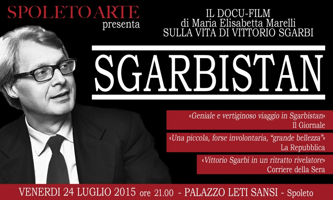 Nel contesto della grande mostra di "Spoleto Arte" a cura di Vittorio Sgarbi, che si svolge dal 27 giugno al 27 luglio a Spoleto, presso l'antico Palazzo Leti Sansi, situato tra via Arco di Druso e Piazza del Mercato, si attende un evento speciale in data Venerdì 24 Luglio, alle ore 21.00, con la programmazione del docu-film "Sgarbistan" dedicato al noto critico. L'iniziativa è organizzata dal manager della cultura Salvo Nugnes, presidente di “Spoleto Arte”. La regista milanese che ha realizzato questo particolare documentario, Maria Elisabetta Marelli, ha trovato la giusta distanza per riuscire a descrivere, senza usare filtri, 37 giorni, suddivisi nell'arco di 3 mesi, della vita di Sgarbi, creando un documentario, che racconta anche Vittorio, cioè l'uomo che c'è dietro il personaggio. In questo lasso di tempo il professore ha visitato 42 mostre e 35 chiese, ha rilasciato 73 interviste, è intervenuto in 27 conferenze, ha visionato il materiale di 25 artisti, ha pernottato in 31 alberghi e ha dormito a casa soltanto per 2 notti. Testi, prefazioni, introduzioni, articoli e libri scritti in tale periodo non si contano. La Marelli, filmmaker dallo sguardo guerriero e dalla voce fatata, ha tenuto una camera a mano giorno e notte, da Parigi a Salemi, dalle Marche a Genova, dalla camera da letto ai ristoranti, dal bagno degli hotel alla sua casa-museo di Ro Ferrarese, raccogliendo 190 ore complessive di girato inedito, che nel montaggio sono state rielaborate a 75 minuti di film effettivo. In riferimento alla scelta del titolo, spiega: "Sgarbistan significa simbolicamente un ultra-regno senza confini fisici, ma solo intellettuali, di cui Sgarbi è monarca assoluto e la cui capitale geografica è la città nella quale in quel momento lui si trova". Definito «geniale e vertiginoso» da Il Giornale, considerato «una piccola, forse involontaria, "grande bellezza"» da La Repubblica e come «ritratto rivelatore» di Vittorio Sgarbi dal Corriere della Sera, "Sgarbistan" fa luce sulla vita privata oltre che professionale dell'autorevole critico d'arte, evidenziando anche il lato umano e meno conosciuto del più tenace difensore delle bellezze d'Italia, animato da un forte senso di giustizia, tra amore per l'arte e sdegno verso ogni forma di ignoranza.