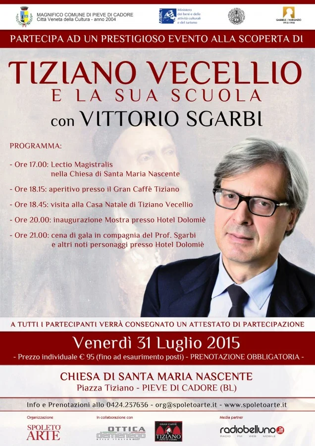 Si annuncia un evento imperdibile e di forte risonanza mediatica quello, che si svolgerà in data Venerdì 31 luglio 2015 con protagonista il Prof. Vittorio Sgarbi a Pieve di Cadore (BL) dal titolo “Tiziano Vecellio e la sua scuola”. Si tratta di una speciale giornata organizzata dedicata a Tiziano, esimio maestro originario del luogo, per ricordare uno dei principali esponenti della storia dell'arte di tutte le epoche. L'iniziativa, organizzata dal manager produttore Salvo Nugnes, presidente di “Spoleto Arte” e patrocinata dal Magnifico Comune di Pieve di Cadore, inizierà alle ore 17.00 presso la Chiesa Arcidiaconale di Santa Maria Nascente, dove il Prof. Sgarbi terrà un incontro in stile Lectio Magistralis con guida alle opere dell'artista. Finito l'incontro e dopo un momento conviviale di aperitivo presso il Gran Caffè Tiziano, tutti i presenti avranno la possibilità di partecipare alla visita guidata alla Casa Natale di Tiziano, antica residenza familiare dove è nato, che attualmente ospita, al pian terreno, una raccolta di riproduzioni della collezione di disegni tizianeschi della galleria degli Uffizi di Firenze e dell'inedita documentazione relativa al celebre pittore. La giornata si concluderà presso l'Hotel Dolomié, situato in via Privata Dolomiti n. 18, con un’esclusiva cena di gala in compagnia del noto critico e di altre personalità di spicco. Nell’occasione, presso la rinomata struttura alberghiera si inaugurerà inoltre la mostra collettiva “Suggestioni artistiche”, che fino al 30 Agosto ospiterà le opere di talentuosi artisti contemporanei. «Tiziano ha abbattuto un muro, ha superato le sacre conversazioni di madonne e santi per farci ascoltare dialoghi d'amore tra giovani donne e giovani uomini. Se Giorgione era stato preso dalla condizione atmosferica, Tiziano attribuisce maggior peso alla presenza e all'interazione degli uomini» scrive Sgarbi e prosegue «Tiziano supera un confine e apre una strada al suo vecchissimo maestro Bellini. Intendeva dare prove della sua nuova interpretazione del mondo, profana, mondana e in talune prove più filosofica e umanistica di quella rappresentata da Giorgione». Un ringraziamento a Radio Belluno, che collabora in qualità di mediapartner dell'evento. Per partecipare all'evento la prenotazione è obbligatoria. Per info e costi: Tel. 0424/237636 - org@spoletoarte.it