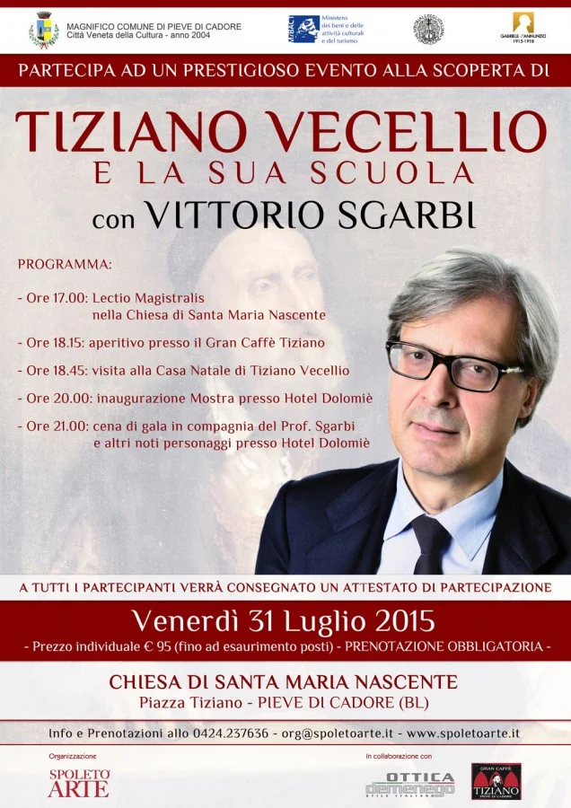 Si annuncia un evento imperdibile e di forte risonanza mediatica quello, che si svolgerà in data Venerdì 31 luglio 2015 con protagonista il Prof. Vittorio Sgarbi a Pieve di Cadore (BL) dal titolo “Tiziano Vecellio e la sua scuola”. Si tratta di una speciale giornata organizzata dedicata a Tiziano, esimio maestro originario del luogo, per ricordare uno dei principali esponenti della storia dell'arte di tutte le epoche. L'iniziativa, organizzata dal manager produttore Salvo Nugnes, presidente di “Spoleto Arte” e patrocinata dal Magnifico Comune di Pieve di Cadore, inizierà alle ore 17.00 presso la Chiesa Arcidiaconale di Santa Maria Nascente, dove il Prof. Sgarbi terrà un incontro in stile Lectio Magistralis con guida alle opere dell'artista. Finito l'incontro e dopo un momento conviviale di aperitivo presso il Gran Caffè Tiziano, tutti i presenti avranno la possibilità di partecipare alla visita guidata alla Casa Natale di Tiziano, antica residenza familiare dove è nato, che attualmente ospita, al pian terreno, una raccolta di riproduzioni della collezione di disegni tizianeschi della galleria degli Uffizi di Firenze e dell'inedita documentazione relativa al celebre pittore. La giornata si concluderà presso l'Hotel Dolomié, situato in via Privata Dolomiti n. 18, con un’esclusiva cena di gala in compagnia del noto critico e di altre personalità di spicco. Nell’occasione, presso la rinomata struttura alberghiera si inaugurerà inoltre la mostra collettiva “Suggestioni artistiche”, che fino al 30 Agosto ospiterà le opere di talentuosi artisti contemporanei. «Tiziano ha abbattuto un muro, ha superato le sacre conversazioni di madonne e santi per farci ascoltare dialoghi d'amore tra giovani donne e giovani uomini. Se Giorgione era stato preso dalla condizione atmosferica, Tiziano attribuisce maggior peso alla presenza e all'interazione degli uomini» scrive Sgarbi e prosegue «Tiziano supera un confine e apre una strada al suo vecchissimo maestro Bellini. Intendeva dare prove della sua nuova interpretazione del mondo, profana, mondana e in talune prove più filosofica e umanistica di quella rappresentata da Giorgione». Per partecipare all'evento la prenotazione è obbligatoria. Per info e costi: Tel. 0424/237636 - org@spoletoarte.it