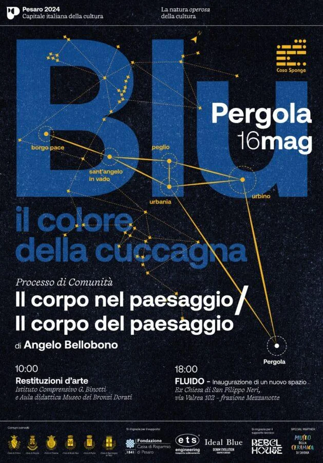 Con Il corpo nel paesaggio/il corpo del paesaggio di Angelo Bellobono si chiude un importante capitolo del progetto ‘Blu: il colore della cuccagna. Tre gli spazi coinvolti nella giornata di giovedì 16 maggio a Pergola: Il parco scolastico dell'Istituto Comprensivo G.Binotti, la sala didattica del Museo dei Bronzi Dorati e il nuovo spazio “FLUIDO”, che inaugurerà per l’occasione. “Il corpo nel paesaggio/il corpo del paesaggio” è una importante sezione di ‘Blu: il colore della cuccagna’, il progetto diffuso di Pesaro 2024 - Capitale italiana della cultura attuato da Casa Sponge, costruito attorno al tema del blu con un preciso riferimento alla pianta Isatis tinctoria tipica dell’area conosciuta come ‘guado’. Collocato nella sezione della ‘natura operosa’ della cultura, il progetto attribuisce a questa tinta un inestimabile valore, sottolineando il suo profondo legame storico con l'ambito dell'arte. Vi è inoltre riflessa la nascita di un ‘distretto produttivo’ ante litteram, in cui l'arte si fonde con l'agricoltura, la biologia, la chimica e l'economia, dando vita a una sorta di autentica ‘Natura della Cultura’ perfettamente in linea con Pesaro 2024. Partner i comuni di: Pergola, Urbania, Urbino, Borgo Pace, Peglio e Sant’Angelo in Vado. ‘BLU: il colore della cuccagna’ coniuga il contemporaneo con antichi saperi e tradizioni legati alle arti tintorie, per generare una visione futura abbracciata e condivisa dalla comunità. Questo principio si concretizza in una serie di attività che si stanno sviluppando nell'intero anno toccando tutto il territorio. Nucleo fondante dell'intero percorso è rappresentato dalla mostra ‘L’Oro Blu’ a cura di Leonardo Regano, che apre le collezioni d’arte del Museo dei Bronzi Dorati e della Città di Pergola al confronto con l’opera di 40 artisti contemporanei, mettendo in dialogo le ricerche di maestri e giovani talenti della scena artistica attuale sul tema del Blu e dell’Oro. Da qui, seguendo la linea filosofica di Casa Sponge, nel corso dell’anno si dipanano residenze, workshop, attività diffuse nei borghi, residenze e dialoghi con gli artisti, laboratori e seminari di impronta didattica che vedranno coinvolte le comunità. L’obiettivo è importante: affidare all'arte la memoria passata e recente con il compito di trasformare e generare una visione futura. Con il Il corpo nel paesaggio/il corpo del paesaggio si chiude un importante capitolo. Sarà una intera giornata dedicata alla restituzione delle attività laboratoriali svolte dagli insegnanti e studenti dell’Istituto Comprensivo G. Binotti di Pergola con Angelo Bellobono: artista che attraverso la pittura distilla atmosfere e racconti sospesi indagando il rapporto tra antropologia, geologia, identità e confine. L’artista ha condotto giovani e docenti alla scoperta del Museo dei Bronzi Dorati e della natura di prossimità. Una esperienziale durante la quale sono stati stimolati a leggere il confronto delle collezioni d’arte del Comune di Pergola con il contemporaneo, gli elementi del paesaggio, le azioni e le sensazioni sperimentate (fatica, percezione del sé nel contesto, sollecitazioni sensoriali, ecc.). In seguito sono state realizzate opere con elementi naturali. I luoghi coinvolti sono tre. Alle ore 10 l’appuntamento è al parco scolastico dell'Istituto Comprensivo G.Binotti si proseguirà successivamente presso la nuova aula didattica del Museo dei Bronzi Dorati e alle ore 18 ci spostiamo nella campagna di Mezzanotte (Via Valrea 102 - frazione Mezzanotte), dove per l'occasione viene inaugurato "FLUIDO", un nuovo spazio all'interno di una chiesa del XVIII sec. appena restaurata e che ospiterà per l'occasione un'installazione realizzata dall'artista con la comunità. Nel progetto Il corpo nel paesaggio/il corpo del paesaggio gli alunni della scuola primaria di Pergola sono stati accompagnati lungo il percorso dalla sapiente maestria dell’artista Angelo Bellobono. Studenti e i docenti sono stati guidati in un viaggio partito dall’ambiente fisico, dal paesaggio circostante, per approdare al Museo dei Bronzi Dorati con uno sguardo diverso, vivo ed emozionante. Bellobono ha mostrato l’arte come forma d’incontro, di relazione viva e vivace invitando tutti a percorrere, giocare, osservare, rappresentare, dipingere, narrare e risanare. Stimolante e sfidante, - scrive la maestra Rosanna Marchetti - oltre che piacevole e formativa, è stata vivere questa esperienza insieme ad Angelo. L’intuito e l’empatia dell’artista, l’entusiasmo dimostrato dagli alunni e le produzioni artistiche derivate (generate?) sono state segno tangibile dell’esito positivo del progetto. Insieme all’artista i più piccoli hanno ispezionato il villaggio scolastico, raccolto elementi naturali, giocato con essi e creato elaborati che hanno restituito una nuova vita agli elementi stessi, trasformati in animaletti, farfalle, bambini e addirittura in sole luminoso. Le classi intermedie sono state invitate a compiere un’escursione, dentro il piccolo bosco sull’altura che delimita lo spazio del villaggio scolastico, a osservare alberi e impronte, a immaginare e raccontare il vissuto passato e presente degli alberi abbattuti, a esprimere le proprie emozioni, a realizzare attraverso le trappole pittoriche due grandi dipinti, utilizzando il colore ricavato dalla terra dell’orto scolastico e altre tinte naturali. Gli alunni più grandi sono stati sollecitati a compiere un viaggio all’interno delle emozioni suscitate in loro da alcune opere d’arte esposte al museo e alla narrazione del legame fra il colore blu, oro e il tema scelto per l’evento culturale. In seguito, utilizzando prevalentemente tali colori, hanno osservato e rappresentato gli alberi attorno agli edifici scolastici, sono entrati nel paesaggio del quartiere delle Tinte ferito dall’alluvione per raccontare la propria e altrui resilienza attraverso parole e immagini rilevate, ripr