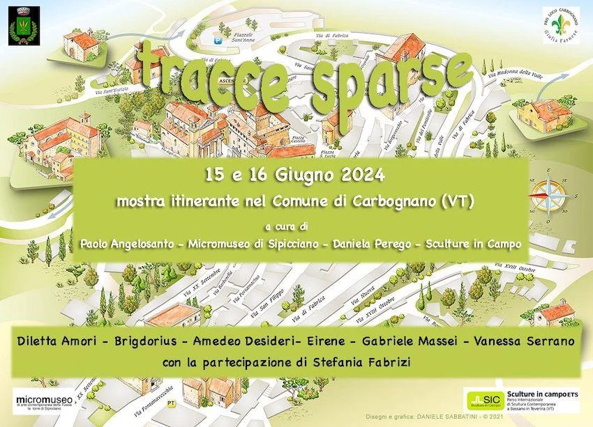 Tracce sparse a Carbognano 2024 I edizione 15 - 16 giugno 2024 dalle 12.00 alle 21.00 Sedi varie - Carbognano (VT) Il 15 e 16 giugno 2024 apre a Carbognano, borgo in provincia di Viterbo, la prima edizione di Tracce sparse a Carbognano, da un’idea di Daniela Perego, a cura di Paolo Angelosanto, MicroMuseo di Arte Contemporanea della Tuscia, Daniela Perego e Sculture in Campo - Parco di Scultura Contemporanea, con il patrocinio del Comune di Carbognano e della Pro Loco di Carbognano. Il progetto verrà presentato il 15 giugno 2024 alle ore 12.00 presso la Chiesa di Santa Maria, alla presenza delle istituzioni, dei curatori - Paolo Angelosanto, Antonio Arevalo, Lucilla Catania e Daniela Perego - e degli artisti coinvolti. Tracce sparse a Carbognano è una mostra itinerante nel centro storico che si snoda in un percorso di opere d’arte realizzate da giovani artisti emergenti operanti nella zona del viterbese, in modo da coinvolgere la comunità locale nell’accoglienza e nel dialogo con l’arte e gli artisti. Nei giorni di inaugurazione sarà possibile percorrere le strade di Carbognano ed incontrare gli interventi di Diletta Amori, Brigdorius, Amedeo Desideri, Eirene, Gabriele Massei, Vanessa Serrano. Inoltre per questa prima edizione, il giorno di inaugurazione del 15 giugno verrà presentato un grande murales ad opera di Stefania Fabrizi, che approfondirà il tema della violenza di genere. Il borgo di Carbognano si conferma, così, centro di produzione del contemporaneo, ripercorrendo e continuando una storia pluridecennale, incentrata sulla promozione e la diffusione delle nuove ricerche artistiche, che ha avuto inizio nel 2002 con il progetto Centro per l'Arte Contemporanea di Carbognano, nato da un’idea dell’artista Anna Ajò e che ha coinvolto numerosi artisti di nazionalità e specificità espressive differenti. Con Tracce sparse, come con i progetti che lo hanno preceduto, l’arte contemporanea dialoga, dunque, con la storia e l’architettura: dal Castello Farnese, dimora di Giulia Farnese, personalità di spicco del rinascimento di cui quest’anno ricorre il cinquecentenario della morte, alle numerose chiese cinque e seicentesche, ai vicoli del borgo di origine etrusche. Le opere rimarranno visibili a Carbognano per un anno intero, fino alla presentazione dell’edizione successiva. INFO Tracce sparse a Carbognano 2024 I edizione A cura di Paolo Angelosanto, MicroMuseo di Arte Contemporanea della Tuscia, Daniela Perego e Sculture in Campo - Parco di Scultura Contemporanea Con il patrocinio e il contributo del Comune di Carbognano e della Pro Loco di Carbognano Artisti: Diletta Amori, Brigdorius, Amedeo Desideri, Eirene, Gabriele Massei, Vanessa Serrano Con la partecipazione di Stefania Fabrizi 15 - 16 giugno 2024 dalle 12.00 alle 21.00 Sedi varie - Carbognano (VT) Contatti Daniela Perego info@danielaperego.com tel. 328199544 www.danielaperego.com Ufficio Stampa Roberta Melasecca Melasecca PressOffice - Interno 14 next - blowart tel 3494945612 - roberta.melasecca@gmail.com - Cartella stampa su www.melaseccapressoffice.it