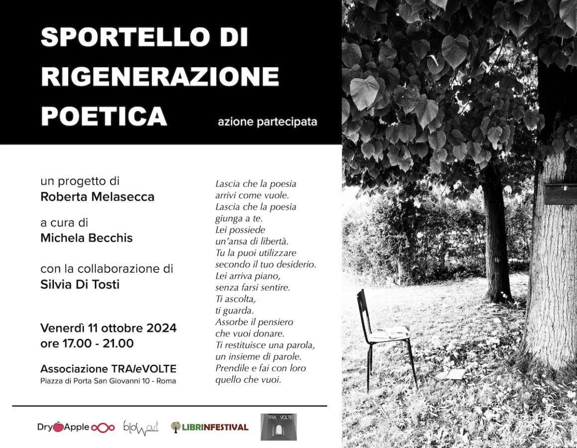Sportello di Rigenerazione Poetica Azione partecipata di Roberta Melasecca un progetto di Roberta Melasecca a cura di Michela Becchis con la collaborazione di Silvia Di Tosti Venerdì 11 ottobre 2024 ore 17.00 - 21.00 Associazione TRAleVOLTE Piazza di Porta San Giovanni 10 - Roma Lascia che la poesia arrivi come vuole. Lascia che la poesia giunga a te. Lei possiede un’ansa di libertà. Tu la puoi utilizzare secondo il tuo desiderio. Lei arriva piano, senza farsi sentire. Ti ascolta, ti guarda. Assorbe il pensiero che vuoi donare. Ti restituisce una parola, un insieme di parole. Prendile e fai con loro quello che vuoi. Venerdì 11 ottobre 2024, dalle 17.00 alle 21.00, negli spazi dell’Associazione TRAleVOLTE sarà possibile accedere ad uno Sportello di Rigenerazione Poetica, un luogo semplice, dove la poesia attende chi voglia incontrarla, anche solo per qualche istante, nel segreto di un momento condiviso. «C’è un librino piccolo piccolo di Giorgio Caproni che si intitola Sulla poesia in cui il grande poeta parla in ordine sparso ovviamente della poesia. Sarebbe dovuta essere una conferenza, ma divenne una chiacchierata, un dire, nel modo frammentato tipico di un dialogo, alcune sue riflessioni sul senso della parola poetica, della costruzione poetica e dell’offrire poesia. Ecco: offrire poesia. Perché qui, in ciò che Roberta Melasecca propone, si sta parlando non di una performance poetica, ma un consegnare un testo poetico che non potrà che essere gradito nella sua nudità. E non potrà che esserlo proprio in virtù del fatto che quelle parole prenderanno corpo per il tramite della sua lettura. Non una semplice assistenza alla comprensione, come la parola SPORTELLO potrebbe far pensare, ma un dialogo in cui ci si divide i compiti – leggere ed accogliere – affinché la parola viva. Scherzosamente si potrebbe dire che semmai l’assistenza viene prestata alla poesia. Scrive Caproni che per un anno girò le scuole a leggere poesie. Non abbandonare su un foglio, su una lavagna, nella pagina di un’antologia “l’inerte linguaggio grafico”, ma dicendola, pure non tanto bene magari. “Io mi ricordo una volta: Forse perché della fatal quiete Tu sei l’imago Poi mi misi a ridere, dissi, “figuriamoci se voi capite cos’è la fatal quiete” “Aho!!” fecero “è la morte, no!!” Lo Sportello Poetico di Roberta Melasecca è quindi il dono di poter sentire e non leggere la poesia e quando si scrive sentire si intende capire attraverso i sensi e avere coscienza che quella comprensione è una sinestesia regalataci dalla sua voce, dal suo sguardo, dal suo essere, diventare per noi testo poetico e farne una preziosa zona condivisa. Cammina nella poesia Roberta, inseguendo se stessa e alla fine trovando sempre gli altri.» Michela Becchis «La poesia è talento. Il talento è un dono. Regala un'intimità fragile e sospesa, senza chiedere nulla in cambio. Se non la nostra totale disponibilità ad accogliere l'energia e l'emozione più profonda che da essa deriva. Roberta Melasecca sperimenta, con chi vorrà, la libertà di fruire della parola come antitodo e cura. Nessuna frustrazione, né senso di inadeguatezza ne sortiranno. Ho imparato a cogliere quanta generosità possa nascondersi dietro al gesto poetico. Un invito per tuttə a incominciare.» Silvia Di Tosti «La poesia nasce dalla realtà della nostra quotidianità. Lei emerge dai sommersi e lì rimane, in un’ansa di libertà, finché il poeta non la solleva e la genera alla luce. La poesia è la domanda alle domande, è l’ascolto di chi parla piano, è l’urlo di chi volta la faccia, è il canto soave per la testa dei bambini, la spina conficcata nella carne. Dilaga senza farsi vedere, si ritira alle richieste degli astanti, si insinua senza desiderare nulla. Con lei puoi essere sincera: lei non ti giudica, non ti dà consigli, non risolve i tuoi problemi. Sta e rimane inerme finché tu non la attivi, nel modo che solo tu conosci. Ti chiede solo una cosa: incontrarla. Potrà forse rigenerare il tuo pensiero. Ma sarai tu a deciderlo.» Roberta Melasecca Lo Sportello di Rigenerazione Poetica è un progetto e un’azione partecipata di Roberta Melasecca, a cura di Michela Becchis, con la collaborazione di Silvia Di Tosti e Librinfestival, con la collaborazione dell’Associazione Culturale TRAleVOLTE e promosso dall’associazione culturale blowart. Roberta Melasecca - Architetto, curatrice indipendente, progettista culturale ed esperta in comunicazione per l’arte e l’architettura. Segue il lavoro e le ricerche di numerosi artisti, scrivendo testi critici e promuovendo da oltre 10 anni progetti curatoriali sia in Italia che all’estero, collaborando con diverse realtà culturali. È attivamente coinvolta nell'editoria d'arte, contribuendo a pubblicazioni e cataloghi, e si dedica allo sviluppo di pratiche performative innovative. Per cinque anni ha diretto lo spazio indipendente Interno 14 a Roma. Con il suo studio di mecenatismo interdisciplinare Interno 14 next è stata selezionata dalla Fondazione MAXXI per il progetto The Indipendent che raccoglie i principali spazi indipendenti in Italia. È ambasciatrice di Cittadellarte - Fondazione Pistoletto ONLUS e presidente dell'associazione culturale Blowart. Da cinque anni promuove il progetto del Festival del Tempo con il quale lavora su alcuni degli Obiettivi dell’Agenda 2030. Collabora con la rivista ‘Art a part of culture’; è responsabile della Sezione arte di ‘VulnerarTe Magazine’ e dei Progetti Speciali e Comunicazione del Movimento VulnerarTe APS. Scrive testi poetici: di ultima pubblicazione il volume Attraversamenti. Un racconto in prosa e in poesia, di prossima pubblicazione una seconda raccolta di poesie ed un saggio di natura filosofico-sociale. INFO Sportello di Rigenerazione Poetica Azione partecipata di Roberta Melasecca Un progetto di Roberta Melasecca a cura di Michela Becchis Con la collaborazione di Silvia Di Tosti e Librinfestiva