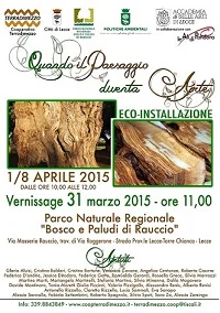 QUANDO IL PAESAGGIO DIVENTA ARTE eco-installazioni vernissage 31 marzo ore 11,00 1/8 aprile 2015 Parco Naturale Regionale “Bosco e Paludi di Rauccio” via Masseria Rauccio, trav. a dx di via Roggerone – strada prov.le Lecce - Torre Chianca Lecce ingresso libero Martedì 31 marzo alle ore 11,00 il Parco Naturale Regionale “Bosco e Paludi di Rauccio” aprirà le porte all’arte con il vernissage della mostra mostra eco-installativa “Quando il Paesaggio diventa Arte”. La mostra, organizzata dalla Cooperativa Terradimezzo con la collaborazione dell’Associazione “Le Ali di Pandora”, ha il Patrocinio: della Città di Lecce, dell'Ass.to alle Politiche Ambientali e dell’Accademia di Belle Arti di Lecce. Dal 31 marzo all’ 8 aprile si potranno apprezzare le opere di Land Art realizzate dagli studenti delle due cattedre di Decorazione dell'Accademia di Belle Arti di Lecce: Gloria Aluisi, Cristina Baldari, Cristina Bortune, Veronica Cavone, Angelica Centonze, Roberta Ciaurro, Federica D'andria, Jessica Ditodaro, Federica Gatto, Romualdo Gerardi, Rossella Greco, Silvia Marrazzi, Martina Marti, Mariangela Martinelli, Stefania Martino, Silvia Minenna, Dalila Mogavero, Davide Montinaro, Tonia Moretti, Giulia Piccinni, Valeria Pizzigallo, Alessandra Renis, Alberto Renisi, Antonella Rizzello, Claretta Rizzello, Lucia Sammali, Eva Sanapo, Alessia Sannolla, Fabiola Settembrini, Roberta Spagnolo, Silvia Spoti, Sara Za, Alessia Zaminga. “QUANDO IL PAESAGGIO DIVENTA ARTE” che si fonda sul ruolo pedagogico dell’arte e sul suo valore di senso, uno stimolo alla condivisione, all'apertura. L'idea è di creare una concreta utopia: l'opera dell'uomo che dialoga con la natura. Un grande museo all'aperto, quindi, a disposizione del pubblico in un singolare rapporto tra opere e paesaggio così da creare un dialogo tra arte e natura. Il processo creativo, dunque, agisce sul territorio, mettendo in gioco l’eterno rapporto tra UOMO e NATURA. Tra gli alberi, immerse nel paesaggio si profilano le installazioni dei 32 giovani artisti seguiti, sia nella progettazione che nella realizzazione della mostra, dalla docente di Decorazione Lucy Ghionna. Una comunione tra l'antica energia e la quiete del Parco di Rauccio con le opere che mutano di senso e significato secondo l'incidenza della luce”.
