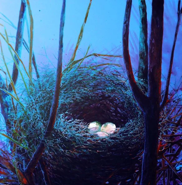 I MISTERI DEL BOSCO INCANTATO ….“Ma è per l'uomo come per l'albero. Quanto più egli vuole elevarsi in alto e verso la luce, con tanto più forza le sue radici tendono verso terra, in basso, verso le tenebre, l'abisso”.... Friedrich Nietzsche, Così parlò Zarathustra, - Dall’albero sul monte Ines Daniela Bertolino si ripresenta al pubblico con questa nuova personale esponendo una serie di opere pittoriche che ripropongono alcuni dei temi più cari all’artista. “Nel bosco incantato”, titolo della mostra, rimanda esplicitamente a luoghi e atmosfere fiabesche, dove i protagonisti non sono fate o elfi, stereotipi della narrazione fantastica, ma tangibili elementi della natura, per questo ancora più affascinanti ed ermetici. Alberi e uccelli sono gli attori principali di questa “fiaba illustrata”, abitanti di luoghi dal fascino misterioso e puro. L’artista ci invita ad entrare, esplorare e scoprire i segreti di un bosco, spazio integro e autentico, animato da giganti muti e fragili creature alate. Ancora una volta ritroviamo come elemento dominante sulla superficie della tela l’azzurro, traccia e segno distintivo del linguaggio pittorico della Bertolino. L’azzurro è una lunghezza d’onda della luce che ci induce alla meditazione, ad osservare tutto ciò che ci circonda nel massimo rispetto, come se ci trovassimo al cospetto di un luogo sacro. La natura rivendica la sua sacralità attraverso il semplice rito del silenzio. Si entra nella composizione percorrendo sentieri che si perdono tra radure e fitta vegetazione, ci si muove tra tronchi fortemente conficcati nella terra , ombre e fasci di luce si alternano tra rami e fogliame. L’azzurro colma i vuoti del cielo, suggerisce suoni, odori, immagini evanescenti, forme rarefatte che emergono nella nostra mente creando allusioni e illusioni. Sono sottili certezze che si dissolvono di fronte a un microcosmo sorprendentemente insondabile. L'albero simboleggia la vita, la rigenerazione ciclica della natura, l'ascensione verso il cielo e lo sprofondamento nella terra, l’unione degli elementi del cosmo. Queste diverse immagini allegoriche si rivelano nei mirabili dipinti dell’artista dando origine ad una ricca sequenza di temi simbolici che ben si adatta al significato che la stessa l'autrice attribuisce alla sua ricerca pittorica. Gli alberi signori e guardiani del bosco si elevano verso l’alto custodendo le intricate trame architettoniche dei nidi degli uccelli. Il nido, strabiliante prodigio della natura, viene analizzato dall’artista con abilità tecnica ed espressiva, una felice simbiosi tra poesia e il rigore quasi scientifico. L’artista riproduce nei nidi anche le uova degli uccelli, altri straordinari archetipi ermetici legati al mistero e alla sacralità della vita. L'uovo simbolo di fertilità, potente amuleto magico, per secoli ha rappresentato nell’arte anche la rinascita dell'uomo. Tutto ciò rimanda alla grande tradizione pittorica, dal Gotico, al Rinascimento, fino all’età Barocca l’uovo si è rivelato quale immancabile complemento narrativo dell’iconografia mistica. In continuità con queste grandi stagioni dell’arte figurativa anche la Bertolino ripropone in chiave laica e contemporanea le sue algide uova, fragili scrigni pronti a schiudersi per donare la vita a un nuovo piccolo essere alato. Interessante sul piano stilistico si rivela anche la scelta di frazionare le immagini in sezioni separate conferendo alla composizione un andamento fortemente dinamico. Come sequenze di un filmato la struttura degli alberi viene separata suggerendo all’occhio dell’osservatore di andare oltre il perimetro fisico della tela, i “fotogrammi” si espandono e i soggetti rappresentati si allungano oltremodo verso l’alto accentuando la loro maestosa presenza. Ines Daniela Bertolino riconferma in queste opere tutta la sua innegabile abilità di grande tessitrice di atmosfere ed emozioni, la cura non comune nel plasmare forme e spazi calibrando la composizione con metodo e rigore tecnico. Nulla è lasciato al caso, anche il minimo dettaglio è il risultato di un algoritmo matematico, dove la sapienza e l’abilità professionale dell’artista si rivela solo parzialmente, nascondendo con un certo compiacimento anche qualche personale segreto alchemico nel trattamento e stesura del pigmento dei colori acrilici. I segreti del mestiere, come nelle antiche gilde medievali e le regole ferree della percezione visiva conducono quindi, senza facili scorciatoie, a riconoscere nei dipinti della Bertolino i caratteri di vere opere d’arte. Stefano Greco
