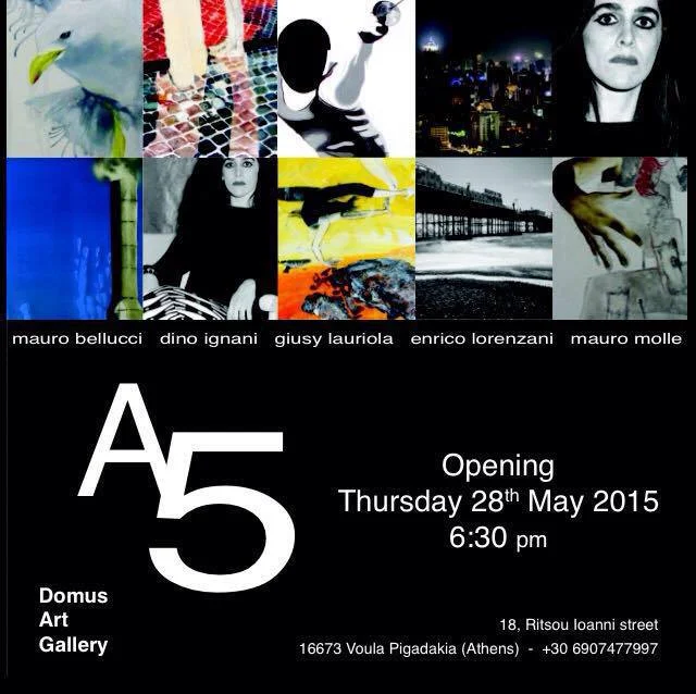 Domus Art Gallery inaugura ad Atene giovedì 28 maggio la mostra collettiva dal titolo A5, acronimo per i 5 Artisti italiani che insieme espongono nella galleria ateniese: due fotografi Dino Ignani e Enrico Lorenzani e tre artisti visivi, Mauro Bellucci, Giusy Lauriola e Mauro Molle. A5 si riferisce anche alla dimensione, lunghezza e altezza di un foglio di carta che in questo caso è proprio la dimensione del catalogo presentato. Ogni artista ha scelto la sua dimensione per esprimersi con una serie di opere, selezioniate come mini personali. Dino Ignani espone foto in bianco e nero della musicista greca, Diamanda Galas, scattate nel 1984 quando venne a Roma per un concerto mentre il fotografo stava lavorando da un paio d’anni al progetto "Dark Portraits". Lei era un'icona per molti giovani che si riconoscevano nella cultura underground degli anni ottanta - che in Italia era comunemente chiamata Dark -. Ignani ricorda la gentilezza e disponibilità della cantante che, anche dopo il lungo e impegnativo concerto, gli dedicò il tempo necessario per farsi fotografare. Enrico Lorenzani nel progetto “City lights” ruba la luce per afferrare e rendere eterna l’anima delle città: dal romanticismo di Praga, alla melanconia di Brighton o alla confusione scintillante di Bangkok. Ruba, sottrae per trasferire tutto nei suoi lavori e rendere partecipe lo spettatore delle sensazioni e dei sentimenti provati nel processo creativo. Mauro Bellucci and Mauro Molle hanno decido di presentare un’installazione dei loro lavori dal titolo Bio Tech. Le ciminiere di Bellucci rappresentano uno dei prodotti costruiti dall’uomo, che in parte hanno contribuito all’inquinamento del nostro pianeta. Molle mette in scena la caccia tra gli uccelli e le mosche. Per entrambi il gioco è tra prede e predatori che sia l’essere umano e il suo pianeta o due rappresentanti del mondo animale. Bellucci, inoltre, espone gli Schermitori: solitari eppure catalizzatori di sguardi e di attese e di promesse, i suoi atleti inseguono, oscuri e celati in volto, il loro destino, metafora della rappresentazione dell’eroe mancante nella società contemporanea in cui potenzialmente ognuno ci si può rispecchiare. Molle mette in mostra anche le sue Decostruzioni: “braccia, piedi, gambe, mani, assumono valore simbolico esclusivo, non appendici, sicuramente prosecuzioni di slancio fisico e ideale, che richiedono attenzione e vogliono esprimere soprattutto Energia Vitale” (Romina Guidelli). Giusy Lauriola, presenta una serie di opere che ripercorrono gli ultimi anni del suo percorso artistico. Dai lavori che ritraggono persone che camminano per la città di Roma, cristallizzate dall’uso della resina, agli stessi viandanti, che si vedono spuntare ali sul dorso, metafora di aspirazioni inespresse e resi tridimensionali con l’uso del plexiglass, fino alle ultime opere In cui è avvenuto come un reset del programma, una tabula rasa. Si osserva con occhi nuovi quelle ali, isolate e rese uniche, quelle donne che prima anche se dotate di ali non volavano e ora vincendo la forza di gravità e per la loro destrezza restano sospese in aria, quella terra che vista dall’alto diventa il mondo.