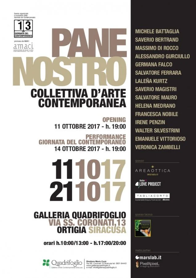 Siracusa - "Pane Nostro" È il tema della tredicesima Giornata del Contemporaneo (14 ottobre), indetta dall'Associazione dei Musei d'Arte Contemporanea Italiani, con eventi, mostre, conferenze e laboratori per promuovere la cultura contemporanea in tutta Italia. La Galleria Quadrifoglio di Via Santi Coronati 13, in Ortigia, aderirà all'iniziativa ospitando una collettiva intitolata proprio "Pane Nostro", dall'11 al 21 ottobre (inaugurazione mercoledì 11, ore 19,00). La mostra, a cura di Mario Cucé, proporrà le opere di quindici artisti: Michele Battaglia, Saverio Bertrand, Massimo Di Rocco, Alessandro Gurciullo, Germana Falco, Salvatore Ferrara, Laleña Kurtz, Saverio Magistri, Salvatore Mauro, Helena Medrano, Francesca Nobile, Irene Penzin, Walter Silvestrini, Emanuele Vittorioso e Veronica Zambelli. Oltre al vernissage, è previsto un secondo momento d'incontro nella galleria tra gli artisti e il pubblico, con una performance che si svolgerà sabato 14 alle ore 19,00 in occasione della Giornata del Contemporaneo. Il titolo della mostra si rifà all'immagine guida tratta dall'opera "Pane quotidiano" di Liliana Moro, artista italiana di fama internazionale scelta quest'anno dall'AMACI per illustrare il tema della manifestazione. Due parole, queste, che esprimono un messaggio essenziale: un rimando alla tradizione biblica e alla preghiera cristiana da un lato; ma anche un riferimento laico all'idea di cibo, inteso come alimento per il corpo e presupposto della nostra esistenza. Facendo leva sul parallelo tra pane e cultura, l'immagine ci parla del nutrimento per eccellenza che diventa elemento di vita, sopravvivenza e crescita per l'individuo e per l'intera società. Da questa ambivalenza nascono molteplici spunti di riflessione che gli artisti, a partire dal proprio percorso di ricerca e adoperando diversi linguaggi espressivi, sviluppano in quindici opere inedite. La mostra si potrà visitare tutti i giorni, dalle ore 10,00 alle 13,00 e dalle ore 17,00 alle 20,00. Info e contatti Galleria Quadrifoglio Arte contemporanea Via SS. Coronati, 13 - Ortigia Tel. 0931 64443 Mail: info@galleriaquadrifoglio.it Sito web: http://www.galleriaquadrifoglio.it/