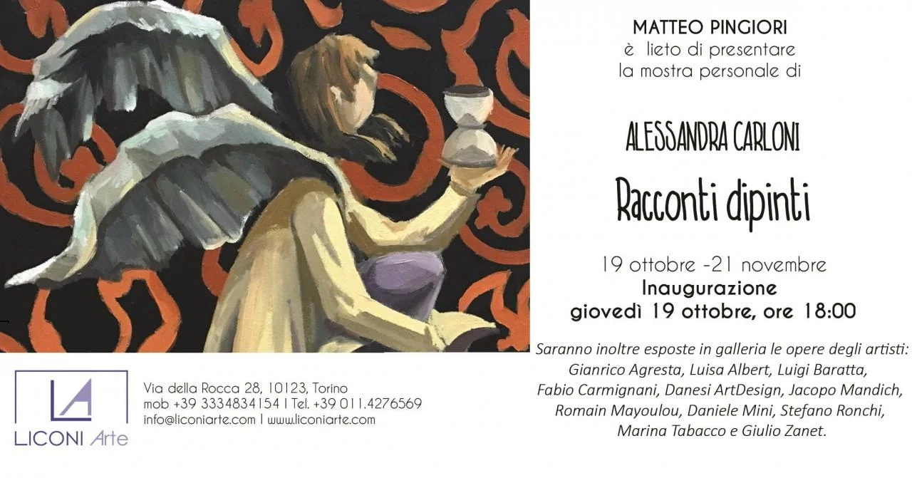 “Racconti dipinti” Mostra personale di Alessandra Carloni da giovedì 19 ottobre a martedì 21 novembre Inaugurazione giovedì 19 ottobre dalle ore 18:00 Alessandra Carloni è un'artista che ha dato voce ai suoi sogni dell'infanzia, ha creato un mondo dove i suoi personaggi, tratteggiati da poche pennellate di colore, idealizzano sentimenti. Il suo stile pittorico è immediato e piacevole, caratterizzato da linee talvolta spigolose, stemperate da gradevoli accostamenti di colore. In una prima fase della sua carriera, l'artista lavorava con una tavolozza caratterizzata da colori tenui, in seguito la gamma di tinte che la Carloni utilizza nei suoi lavori si è ampliata, ora vi è un'equa alternanza di colori freddi e caldi, ma la pennellata rapida e franta rimane una cifra stilistica dell'autrice. La galleria LICONI ARTE ha già avuto modo di far apprezzare al suo pubblico le opere dell'artista romana, in questa mostra sono presenti poche opere del passato e tante opere nuove, le quali sono il risultato dell'evoluzione della “maniera” dell'artista, frutto di riflessione e studio sulla tecnica, dopo le esperienze maturate anche con l'esecuzione di murales, molti dipinti in quest'ultimo anno, presso Torino, Settimo Torinese, Marsala, Valogno solo per citarne alcuni. Altra importante esperienza è stata la realizzazione del progetto grafico per il padiglione Lazio alla manifestazione VINITALY e la serie di opere realizzate per la mostra Cosimo, ciclo di dipinti ispirate alla fatica letteraria di Italo Calvino, “Il Barone Rampante”, della quale mostra sono presenti alcune opere. Alessandra Carloni, nasce a Roma nel 1984, dove vive e lavora. Si diploma all’Accademia di Belle Arti di Roma nel 2008 con la cattedra di Celestino Ferraresi e si laurea nel 2013 in Storia dell’arte contemporanea, presso l’Università “La Sapienza”. Dal 2009 inizia la sua attività di pittrice e artista, esponendo in personali e collettive a Roma e in altre città italiane. In questi anni ha partecipato a diversi concorsi, vincendo diversi premi e riconoscimenti ma, oltre a opere su tela o su carta l'artista si è da sempre cimentata nell'esecuzione di opere murali per committenze private o pubbliche a seguito della vincita di un bando, come nel caso del murales eseguito in piazza Conti di Rebaudengo a Torino nell'ottobre 2016. I principali murales di Alessandra Carloni si trovano nelle seguenti località: Castel Gandolfo (Roma), Castelsardo (SS),Dolo (Venezia), Firenze, Mantova, Milano, Ostia (Roma), Pavona (Roma),Roma, Rovigo , Savona, Settimo Torinese (To), Sulmona(AQ), Torino, Valogno (CE), Venezia.