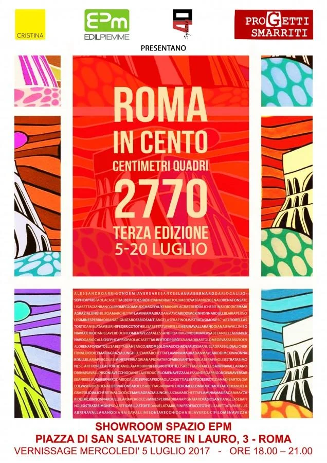 Spazio 40 Galleria d'arte e EPM Edil Piemme presentano la collettiva d'arte del "piccolo formato" ROMA IN CENTO CENTIMETRIQUADRI ... 2770 - Terza Edizione. Alla rassegna partecipano 38 artisti, che sono stati chiamati ad esprimersi sul tema "Roma" dalla curatrice dell'evento, Tina Loiodice, titolare della Galleria Spazio40 a Trastevere. La partnership consolidata tra Spazio40 ed EPM Edilpiemme, azienda leader nel settore delle forniture per l'edilizia, dell'architettura degli interni e del design, ma da sempre attenta e sensibile alle tematiche sociali, culturali ed artistiche, ha consentito, dopo due settimane di esposizione a Trastevere, di organizzare la seconda parte dell'evento 2017 presso il nuovo Showroom EPM di Piazza San Salvatore in Lauro, nel cuore del Centro Storico, a due passi da Castel Sant'Angelo e dal Chiostro del Bramante. L' evento 2017 si è avvalso inoltre del costruttivo sostegno dell'Associazione Progetti Smarriti e di Cristina Rubinetterie. La mostra verrà inaugurata il 5 luglio 2017 alle ore 18.00 e proseguirà fino al 20 luglio. Espongono i loro "piccolini" gli artisti: Alessandro Arrigo, Noemi Aversa, BeeAnKee, Laura Bernard, Dario Calì, Joseph Caprio, Paola Casetti, Alberto Desirò, Tiziana Di Bartolomeo, Evas, Fabrizio Ena, Lorena Fonsato, Elisabetta Gianbanco, Jerome Glomaud Chadefaux, Emanuela Grassi, Lidia Licheri, Tina Loiodice, Maria Grazia Lunghi, Lucia Marchetta, Flaminia Maura, Dan May, Cariddi McKinnon Nardulli, Ilaria Pergolesi, Mines Perri, Adriana Pignataro, Fabio Santi, Angela Serafino, Lisistrata Simone, SC-Art, Fiorella Storti, Daniela Tamburini, Federico Toth, Elisabetta Tufarelli, Sabrina Vallarano, Diana Isa Vallini, Sonia Vecchio, Daniela Verduci, Filomena Vezza Testo di presentazione a cura di Simona Albani Roma ama farsi guardare adagiata sui suoi fasti, e incurante della propria bellezza penetra il cuore dei suoi amanti in mille modi e maniere. Musa maestosa e indolente è da sempre una fonte d’ispirazione per gli artisti e dispensatrice insaziabile di emozioni. Il grande Alberto Sordi diceva che …“Roma non è una città come le altre. È un grande museo, un salotto da attraversare in punta di piedi”, e mai questa citazione fu più calzante. Giunta alla sua terza edizione, "Roma in centocentimetriquadrati" celebra i 2770 anni della città insieme ai trentotto artisti che hanno aderito al progetto e ai suoi curatori Fabrizio Ena e Tina Loiodice, sempre curiosi e attenti nel proporre le loro “chicche d’arte”. I “piccolini” con il loro formato 10 x 10 esprimono in modo inconfutabile la capacità di racchiudere in un piccolo spazio la grandezza di una storia millenaria . Roma è un’icona poliedrica dove trovano spazio pittura, assemblaggi e fotografia; la libera scelta dei materiali è il viatico da portare con sé in quest’avventura. Ogni artista ha il suo bagaglio, una sua firma, il suo modo di raccontare la città: monumenti contaminati di paillettes e fondali marini; cieli tersi e tramonti malinconici; l’asfalto ferito; l’archeologia industriale che strizza l’occhio al Colosseo; i papi simbolo di storie controverse, lo sport e i suoi eroi, i nuovi gladiatori; i ponti di Roma e il suo fiume che scorre e attraversa la storia. Chi con amore, chi con ironia , passione e curiosità racconta la sua Roma al microscopio, la sua visione in miniatura connotando ogni opera della capacità di cogliere un tratto identificativo, un particolare di quell’eterno mostrarsi in un caotico divenire. (SIMONA ALBANI)