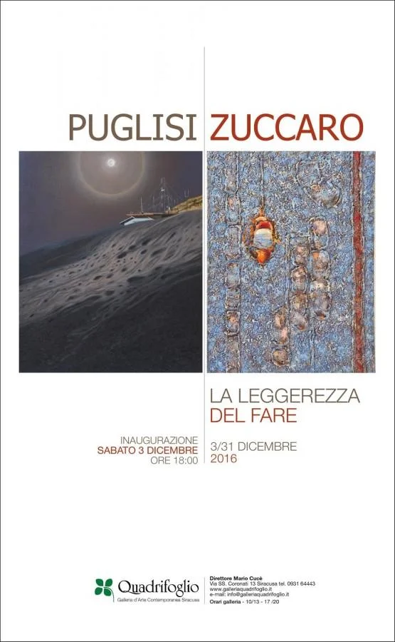 Siracusa - Dal 3 al 31 dicembre la Galleria Quadrifoglio in Via Santi Coronati 13 a Ortigia ospiterà una mostra di Piero Zuccaro e Giuseppe Puglisi dal titolo "La leggerezza del fare", a cura di Mario Cucé (inaugurazione sabato 3 dicembre ore 18,00). Saranno esposte una ventina di dipinti dei due artisti catanesi che fanno parte del Gruppo di Scicli. Le opere dei due artisti, seppur diversi per stile e linguaggio, sono accomunati da percorsi di formazione e dalla condivisione di determinati valori artistici. Giuseppe Puglisi (Catania, 1965) affronta il tema del paesaggio urbano. E lo fa da "catanese che sogna il Nord", come scriveva Lea Mattarella in un saggio del 2007. I suoi sono paesaggi di luci fredde, lunari, come quelli cinerei dell'Etna. Oppure sono visioni dall'alto della terra e del mare. Ma sono anche cieli notturni pieni di stelle e costellazioni sospese nell'infinito silenzio. Piero Zuccaro (Catania, 1967) indaga lo spazio-luce, la mutevolezza della materia, attraverso le "paste alte" stese a spatola del colore a olio, nella pennellata densa e materica che amalgama mille colori. Sulla sua tela si distendono scintille, abrasioni dell'aria, ferite e suture del colore. Come in un caos primordiale. Dense concrezione di paste cromatiche si sedimentano in paesaggi di astratta plasticità, in una realtà corposa e sensuale. La mostra potrà essere visitata tutti i giorni dalle ore 10,00 alle 13,00 e dalle ore 17,00 alle 20,00, domenica e lunedì dalle ore 17,00 alle 20,00 Info e contatti Quadrifoglio Galleria d'arte contemporanea Via SS. Coronati, 13 - Siracusa Tel. 0931 64443 E-mail: info@galleriaquadrifoglio.it Sito web: www.galleriaquadrifoglio.it