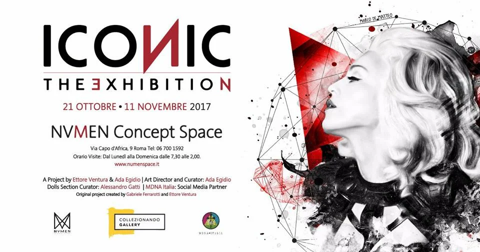 ICONIC - The Exhibition in Rome, LA MOSTRA Dopo il grande successo ottenuto dalle precedenti edizioni di Torino, Napoli, Barcellona, e Palermo, ICONIC - The Exhibition sbarca nella città ICONA per eccellenza: Roma. DAL 21 OTTOBRE ALL'11 NOVEMBRE 2017 NVMEN Concept Space Via Capo d'Africa, 9 Roma. Un progetto Curato e diretto da Ada Egidio CEO di Collezionando Gallery e da Ettore Ventura, responsabile della comunicazione, del Concept Grafico. Una selezione di 20 delle opere in collezione è esposta presso gli spazi della Feltrinelli International Roma. Dal 21 Ottobre all’11 Novembre 2017 le opere che completano la collezione saranno esposte presso lo spazio NVMEN Concept Space, situato nel centro storico di Roma, a due passi dal Colosseo, nuova location ispirata alle diverse declinazioni dell'idea di arte. Il Vernissage si terrà il 21 Ottobre alle 19,00 in presenza di alcuni degli artisti. Un totale di 84 lavori, opere uniche, Digital-art, una selezione curata dal team della Scuola Palermo Foto e le immancabili "Madonna Dolls", creazioni uniche di Artist Creations ed a rendere unica la data Romana i lavori INEDITI degli artisti che hanno risposto al Call For Artists lanciato dal team nel mese di Luglio 2017. ICONIC nasce il 9 settembre 2015, in occasione del Rebel Heart Tour, Montreal, Canada, durante la quale un caleidoscopio di immagini mostrò al pubblico una selezione di artworks realizzati e inviati dai fan alla star. Da qui nascono i presup- posti per questo grande evento di rilievo culturale, sia in quanto celebra un'icona internazionale, quale Madonna, ma altresì perchè promuove l'arte in tutte le sue forme. Gli Artisti: Aldo Diaz, Aleix Pons, Arsen Suleymanov, Fran Sànchez, Jérôme Trudelle, Laertes De Oliveira, Artist Creations, Marco De Matteo, Michelangelo Prencipe, Michele EmmeTre, Mattia Bau Vegni, Nicolas Obery, Noah, Pablo Lobato, Renata Giorgini, Richard Holmes, Rob Jacobs, San Sigüenza, Sergio Daricello, Silvio Alino, Son Of The Moon, Timothy Aerts, Malleus, Mauro Morelli, Joey Holthaus, Branimir Mladenov, Eder Cambui, Matete Perversa, Daniele Volpicelli, Juan Bermudez, Massimo Perna, Village9991, Luciano Carvalho, Mark Lloyd, EFFE, Ted Tan, Giuseppe Sinatra, Alek- sey D'Havlcyon, Francesco Paolo Catalano. ICONIC - The Exhibition in Rome “L’Anteprima” (dal 15 Settembre 2017). Feltrinelli International Roma di Via Vittorio Emanuele Orlando, 86. Orario Visite: Dal Lunedì al Sabato dalle 9:00 alle 20:00. La Domenica dalle 10:30 alle 13:30 e dalle 16: alle 20:00. Ingresso Libero. ICONIC - The Exhibition in Rome “La Mostra”. Dal 21 Ottobre all’11 Novembre 2017. NVMEN Concept Space Via Capo d'Africa, 9 Roma Tel: 06 700 1592 Orario Visite: Dal Lunedì alla Domenica dalle 7,30 alle 2,00. Per maggiori informazioni: collezionandogallery@hotmail.it, iconic.italy@gmail.com Un progetto Ada Egidio ed Ettore Ventura Art Director and Curator: Ada Egidio (CEO di Collezionando Gallery) Dolls Section Curator: Alessandro Gatti Progetto Originale di Gabriele Ferrarotti ed Ettore Ventura MDNA Italia: Social Media Partner