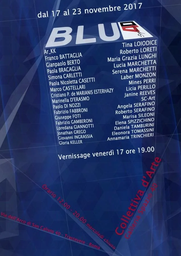 Spazio40 Galleria d'arte, proseguendo la serie delle Mostre dedicate ai colori, dopo il Rosso e la tricromia Bianco – Nero - Rosso, ha organizzato una nuova Collettiva, invitando gli Artisti ad affrontare un altro colore primario, il BLU. Per l'evento, a cura di Tina Loiodice, sono stati selezionati 34 Artisti : Ar_KK, Franco Battaglia, Gianpaolo Berto, Paola Bragaglia, Simona Carletto, Paola Nicoletta Casetti, Marco Castellari, Cristiano P. de Marianis Esterházy, Marinella D'Erasmo, Paolo Di Nozzi, Fabrizio Fabbroni, Giuseppe Foti, Fabrizio Gamberoni, Loredana Giannotti, Jonathan Grego, Giovanni Ingrassia, Gloria Keller, Tina Loiodice, Roberto Loreti, Mara Grazia Lunghi, Lucia Marchetta, Serena Marchetti, Laber Monzon, Mines Perri, Licia Perillo, Janine Reeves, SC-Art, Angela Serafino, Roberto Serafino, Marisa Sileoni, Elena Spizzichino, Daniela Tamburini, Eleonora Tomassini, Anna Maria Trinchieri. Nella settimana di esposizione, la Galleria ospiterà inoltre altri tre eventi : - Per tutta la settimana "Contemporary Visions" - Video-art in loop, un format a cura di Roberto Ronca: la Biannuale di Videoarte che coinvolge artisti internazionali in un percorso articolato e condiviso in diverse locations in tutto il mondo. - Venerdì 17 novembre alle 19.00 la presentazione del libro "Lei guarda spesso il mare - Aspasia"; saranno presenti le autrici Benedetta Banchi, Sandra Beronesi, Sabrina Geppetti, Cristina Petrucci, Ilaria Raffaelli, Caterina Savasta, Ludovica Taliani. - Martedì 21 novembre alle 19.00 la presentazione del romanzo "Misteri solubili"; sarà presente l'autore Sergio Caldaretti. ----------------------------------------- BLU 17 - 23 novembre 2017 Spazio 40 Galleria d'arte Via dell' Arco di S. Calisto 40 - Roma (Trastevere) Orario 12.00 - 20.00 (mercoledì chiuso) Vernissage: venerdì 17 novembre - ore 19.00 Info: 349.1654628 / spazio40@tiscali.it / www.spazio40galleria.it / @Spazio40GalleriaDarte