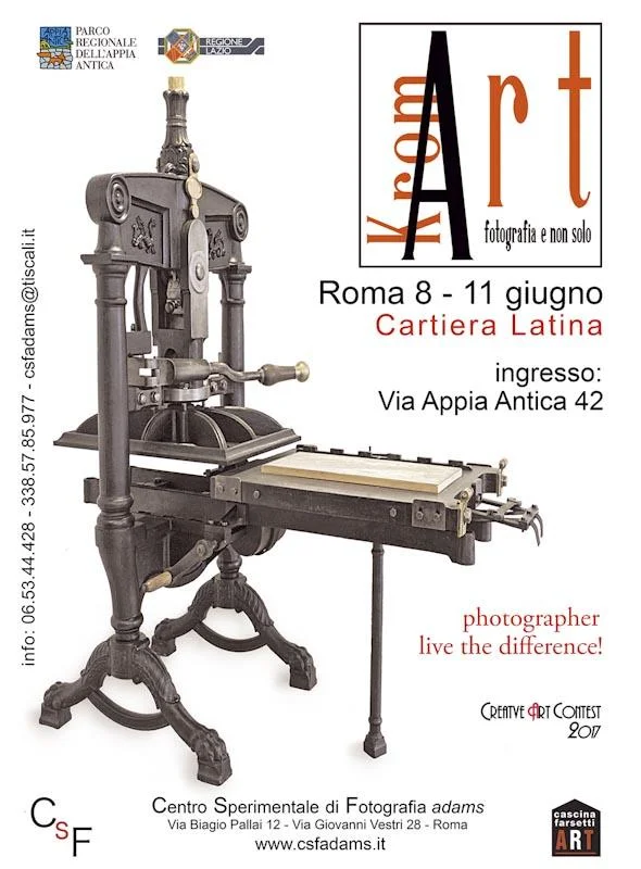 COMUNICATO STAMPA KromArt - fotografia e non solo… Roma 8 – 11 giugno 2017 ex Cartiera Latina Via Appia Antica 42 Il Centro Sperimentale di fotografia adams organizza la prima edizione della manifestazione espositiva fotografica KromArt - fotografia e non solo… nei locali della ex Cartiera Latina dall’ 8 all’ 11 giugno. L’iniziativa, vuole essere un’occasione di incontro, riflessione e dibattito sullo stato della fotografia italiana e internazionale; una vetrina espositiva di autori noti ed emergenti che presentano le loro ultime produzioni fotografiche. KromArt - fotografia e non solo… è un progetto espositivo ad evento annuale che assorbe l’esperienza maturata negli anni da cascinafarsettiArt innovandone la formula e i luoghi espositivi. La stessa manifestazione, proseguirà con una programmazione articolata durante l’anno all’interno dei locali della galleria d’arte KromArt. Espongono: dalla Polonia Kasia Derwinska, dalla Repubblica Ceca Jan Mlcoch e Tomas Paulus, dalla Romania Loredana Bardas, dall’Italia Lucia Brancati, Luciano Carletti, Stefano Cherti, Mario Di Lorenzo, Chiara Pansini, Riccardo Piredda, Katia Rossi, Alessio Vissani, Pina Zenga. Roberta Marsigli, vincitrice della residenza d’artista anno 2016 presso il C.S.F.adams Saranno presenti le opere dei finalisti del concorso fotografico Nessun limite eccetto il cielo…, promosso dal Creative Art Contest, Sara Aguzzoni, Filiberto Galli, Leonardo Perri. Sono previsti seminari e workshop Vi aspettiamo, ingresso libero. Referentie Csfadams - Luisa Briganti +39 338/5785977 csfadams@tiscali.it Info: www.kromart.it www.csfadams.it