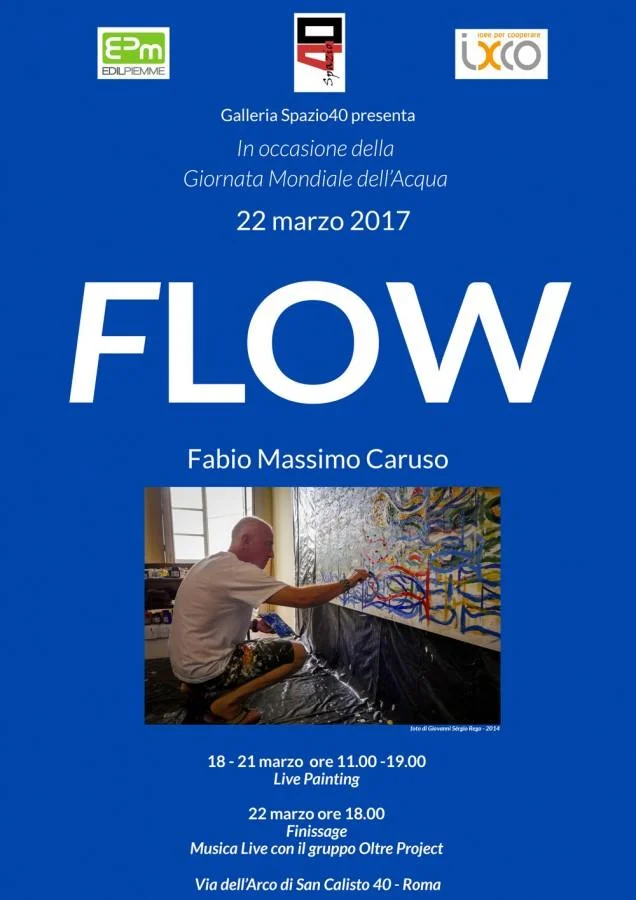 WASTEWATER (acque reflue) , sarà la tematica con cui si celebrerà il giorno 22 marzo 2017 , la Giornata Mondiale dell'Acqua . Le acque reflue sono argomento di profondo interesse internazionale per gli effetti del loro sversamento in fiumi, laghi, stagni, paludi, come pure la necessità del loro recupero a favore delle esigenze primarie dell'umanità e per il sano sviluppo dell'ambiente. FLOW intende rappresentare metaforicamente la connessione tra il flusso pittorico generato dall'Artista sulla tela ed il flusso del prezioso liquido H2O. L' Arte rappresenta quindi , attraverso la pittura , con la purezza e la libertà del gesto poetico , l' azione dell'uomo che mette in atto , per il bene futuro della Terra , la rinascita delle acque reflue in acque per usi sostenibili. Nella poetica del progetto l'acqua ritrova nel suo scorrimento l'antica integrità e grazie all'incontro con la nobile azione dell' uomo viene ricondotta alla sua naturale purezza. A completare il progetto saranno esposte altre opere inerenti al tema dell’acqua, affinché il dialogo con i visitatori assuma un valore più coinvolgente e partecipativo, con l'intento di comunicare quanto l’acqua sia elemento prezioso e insostituibile, che va necessariamente protetto prevenendo il suo inquinamento e il suo impoverimento, amministrando onestamente la sua ricchezza. FLOW Performance dell'Artista Fabio Massimo Caruso , avrà il suo momento culminante il giorno 22 marzo a Roma nella Galleria Spazio 40 in via dell'Arco di San Calisto 40 alle ore 18.00 . Interverrà il Dott. Pier Paolo Pascali , Dirigente AGIS , introducendo il tema dell’evento. Seguirà il gruppo musicale degli Oltre Project con una esecuzione di brani. La formazione per la serata del 22, sarà composta dal pianista, arrangiatore e compositore Lorenzo Apicella, la vocalist Francesca Fusco e il sassofonista Luigi Tresca. Il Trio eseguirà dei brani compenetrati al tema dell’evento. In particolare, uno di questi è “Goccia d’acqua” tratto dal loro album d’esordio "Coloured Shadows". Al termine della performance musicale l’evento continuerà, senza preclusioni d’orario. Nei giorni precedenti, sabato 18, domenica 19, lunedì 20, martedì 21, la Performance dell’artista inizierà in Galleria alle ore 11.00 e proseguirà ininterrottamente fino alle ore 19.00 per tutte le date. Tutto l'evento si avvale della collaborazione di EPM Edil Piemme e di Ixco – Idee per Cooperare.