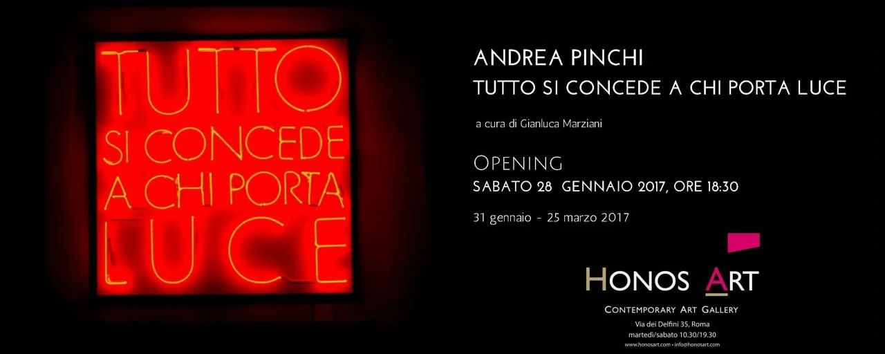 Tutto si concede a chi porta luce di Andrea Pinchi 28 gennaio – 25 marzo 2017 inaugurazione sabato 28 gennaio 2017 ore 18.30 Sabato 28 gennaio, alle ore 18:30, la Galleria Honos Art presenta "Tutto si concede a chi porta luce", mostra personale di Andrea Pinchi, a cura di Gianluca Marziani. L’artista umbro presenta una sequenza di opere recenti dai formati variabili, create tra i silenzi ascetici ed ascensioni barocche del suo studio romano, a pochi passi dalla galleria. Intuizioni che vengono narrate attraverso pelli, carte, fogli di stagno, timbri e cartoni antichi e carte carbone fuori produzione. Geometrie rigorose, colori netti e contrastanti sono capaci di racchiudere temi morali e dilemmi filosofici con un risultato strabiliante, un valore assoluto che intreccia pazienza e conoscenza, uomo e talento, memoria e futuro. L’uso di materiali consunti, metabolizzati dal tempo archeologico, è cucito seguendo geometrie, colori e materiali secondo una planimetria cosmogonica e misteriosa che si confronta con la le passioni, gli incontri e le empatie dell’artista. Seguendo l’indole narrativa di un linguaggio segnico, silenzioso per natura ma connesso al rito filosofico, dietro la forma si avverte il battito ideale di un cuore iconografico. Non accade spesso che l’opera emani l’aura del battito, perché occorre una fluidità narrativa che possa legare il singolo materiale a una progenie di contenuti aperti. Ebbene, di nuovo senza alcuna casualità, ecco il cuore ideale trasformarsi in un cuore stilizzato con le sembianze dello scudo: pura geometria aulica che Pinchi ha elaborato nelle ultime opere, quelle in cui l’aura del colore si trasforma in purissima energia, un riverbero dal sentore astrofisico e dalla presenza metaforica. I cuori aggiunti sembrano ali immobili ma accese, già in volo nel loro atto figurativo: si librano sul bianco e ribadiscono il codice sorgente di Pinchi, il suo generatore metafisico, la fluttuazione cosmica, l’esercizio vivo del dialogo. Andrea Pinchi (Foligno, 1967) nasce in una famiglia di costruttori e restauratori di organi a canne, dove apprende le tecniche di lavorazione del legno antico, carte ossidate, lastre di piombo e di pelli animali. Il viaggio intrapreso nella ricerca del proprio mondo espressivo, lo conduce a quello che è stato definito come il Pincbau, ovvero la costruzione di opere attraverso il riutilizzo dei materiali provenienti da antichi organi musicali. Intuisce ed intravede nei materiali di scarto nasciture opere di alto valore simbolico e artistico. Dopo un debutto nel 2010 al Museo Civico di Palazzo Trinci (Foligno) con una mostra a cura di Maurizio Coccia, partecipa alla 54a Biennale di Venezia nel padiglione per la Regione Umbria/Palazzo Collicola di Spoleto. Nel 2015 espone al Complesso del Vittoriano di Roma con una mostra curata da Claudio Strinati. HONOS ART Via dei Delfini 35 00186 Roma Tel. 0631058440 www.honosart.com / info@honosart.com orari Martedì-Sabato dalle 10.30 alle 19.30/ Per appuntamenti: 348/5828403