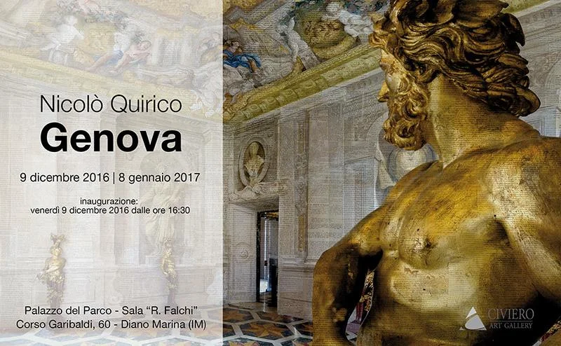 La ricerca di Nicolò Quirico si basa su una complessa struttura di riprese multiple ricomposte in un collage e stampate su fogli di vecchi libri. Le pagine dei libri permettono, avvicinandosi alle opere, di osservare parole e frasi a volte interrotte, che diventano struttura dell’opera stessa rendendola un pezzo unico. Scrive Roberto Mutti: “la particolare tecnica di ripresa […], gli ha permesso di ampliare la visione, dando respiro ad immagini di luoghi che la sinuosità delle strade e dei carruggi in genere impedisce di riprendere nella loro interezza…” La caratteristica di questa esposizione, consiste nel fatto che Quirico, per la prima volta, ha indagato la città in profondità, non soffermandosi solo sui luoghi più noti, ma sviscerandone lo spirito più profondo. Le immagini fotografiche presenti in mostra, raccolte in un catalogo, colgono, in un mix equilibrato ed efficace, il “carattere” della città. Il più importante porto del mediterraneo, la vita del porto trasformata in immagini estetiche: navi, container, picchi di carico, bacino di carenaggio diventano forme e colori di una composizione che ci restituisce emozioni di un ambiente unico. L’obbiettivo dell’artista penetra letteralmente nelle corti dei palazzi, in antichi saloni, ci restituisce inaspettati scorci architettonici e l’emozione di piazzette sconosciute.