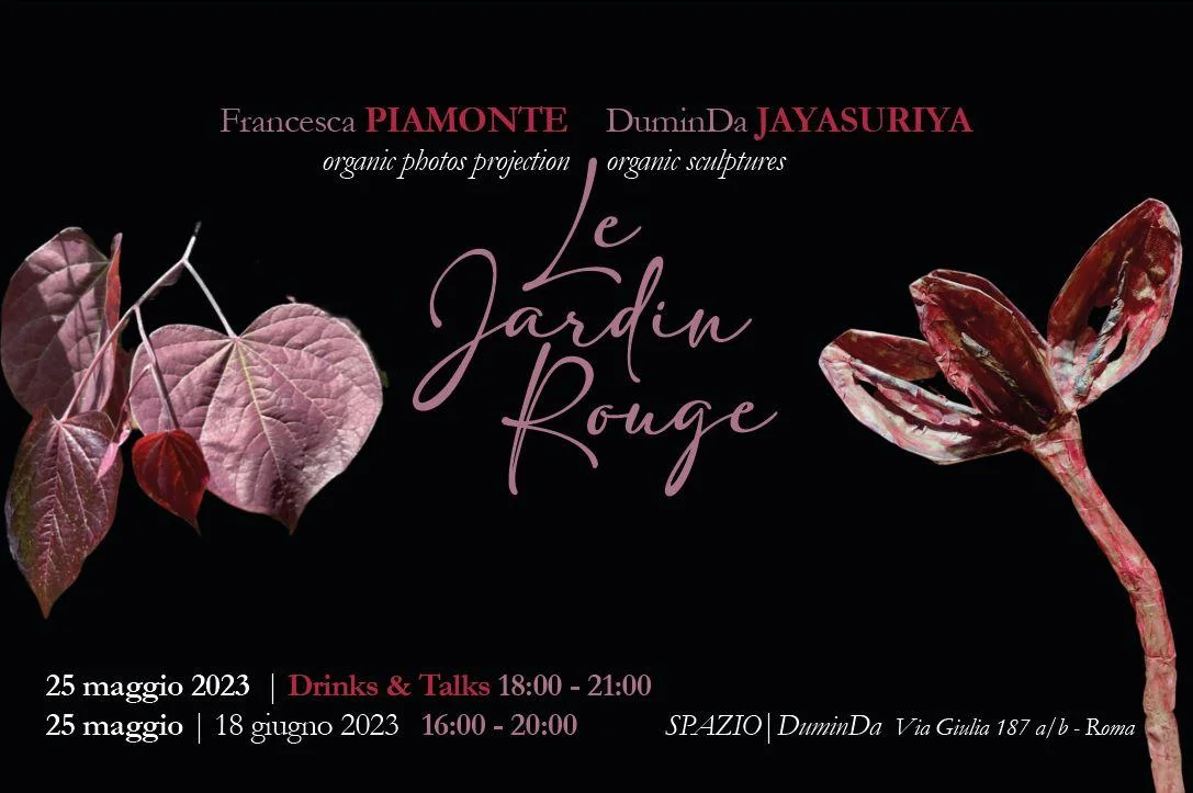 “Le Jardin Rouge,” celebra il percorso parallelo di Francesca Piamonte e DuminDa Jayasuriya, la loro reciproca ammirazione ed il loro modo di avvicinarsi alla Natura per rappresentarla con delicatezza, semplicità e passione, Francesca Piamonte, interprete e linguista di formazione, dopo una lunga e gratificante carriera istituzionale, scopre, con la fotografia, un altro idioma, per dialogare con realtà a noi vicine e familiari, foglie e cortecce, palpitanti di vita o sommessamente tristi. Foto dell’essenziale, quindi emozionanti, che narrano stupore, la scoperta di un mondo parallelo, troppo spesso ignorato o disprezzato, rivisitato con un occhio di riguardo ed ammirazione. Dal 25 maggio al 18 giugno, dalle 16:00 alle 20:00, vi sarà la proiezione d’immagini scelte per dialogare con le creazioni di DuminDa, sculture in carta, gesso e resina, PAPER MOODS e WALL JEWELS, opere sorprendenti e magiche nella loro semplicità.. Il 25 maggio, dalle 18:00 alle 21:00, si svolgerà il consueto “Drinks & Talks”, in presenza degli artisti. Le foto di Francesca Piamonte possono essere stampate su carta, D-bond, tessuto, plexiglas.