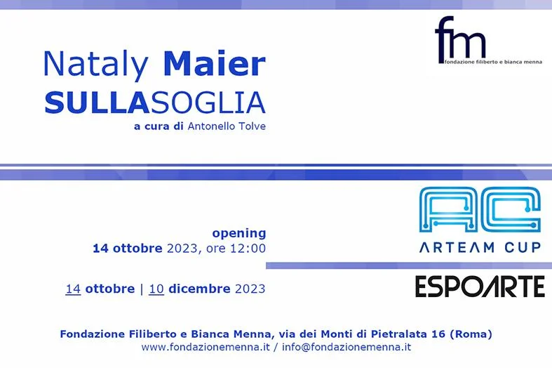 La Fondazione Filiberto e Bianca Menna, il Lavatoio Contumaciale, il Tomav Experience e Arteam Cup | mediapartner Espoarte, sono lieti di annunciare SULLASOGLIA, un progetto esclusivo di Nataly Maier che si terrà nella sede romana della Fondazione, già Archivio Tomaso Binga, in via dei Monti di Pietralata 16, dal 14 ottobre al 10 dicembre 2023, quale premio vincitore – sezione pittura – della 7a edizione di Arteam Cup (concorso ideato dall’Associazione Culturale Arteam di Albissola Marina) tenutasi a Savona, nel Palazzo del Commissario, sulla Fortezza del Priamàr.