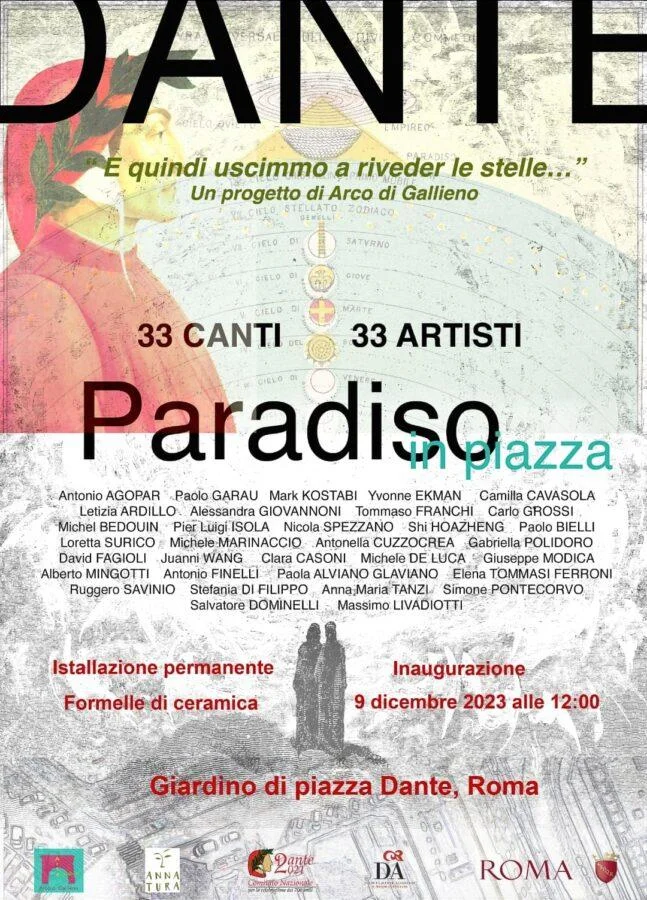 E quindi uscimmo a riveder le stelle… Cantica del Paradiso 33 canti - 33 artisti A cura dell’Associazione Arco di Gallieno Inaugurazione 9 dicembre 2023 ore 12.00 Giardino di Piazza Dante - Roma Sabato 9 dicembre 2023 alle ore 12.00, presso i Giardini di Piazza Dante, verrà inaugurata l’ultima installazione del progetto E quindi uscimmo a riveder le stelle…, la Cantica del Paradiso, promosso dall’Associazione Arco di Gallieno, con il patrocinio di Roma Capitale, del Municipio I Roma Capitale, del Comitato Nazionale per i 700 anni della morte di Dante, dell’Istituto Dante Alighieri, e con il supporto della Soprintendenza Capitolina la quale ha coordinato tutte le fasi dell’allestimento. Interverranno l’Assessora all'Agricoltura, Ambiente e Ciclo dei rifiuti Sabrina Alfonsi, gli artisti e i curatori del progetto. Nell’ambito dei festeggiamenti per celebrare i 700 anni dalla morte di Dante Alighieri, dopo le due installazioni di 67 formelle in ceramica firmate da altrettanti artisti e ispirate alle Cantiche dell’Inferno e del Purgatorio ed inaugurate nel 2021 e nel 2022, l’Associazione Arco di Gallieno presenta il proseguimento del progetto sulla Divina Commedia per il giardino di piazza Dante con le ultime 33 formelle dedicate al Paradiso. A completamento dell’intero progetto, sarà quindi creato un percorso all’interno del giardino per segnalare la posizione di tutte le formelle relative alle tre Cantiche: il percorso con i tre itinerari sarà visibile su un pannello introduttivo all’ingresso principale. Arco di Gallieno si propone di riflettere sull’immaginario dantesco e sulle suggestioni che i diversi artisti possono trarre da esso, ognuno con la propria sensibilità e peculiare cifra artistica. L’intervento proposto, oltre a voler celebrare questo importante personaggio della letteratura italiana, conferma la vocazione dell’Associazione a valorizzare i luoghi del rione come già avvenuto in passato con altri progetti, proposte ed eventi. I 33 artisti partecipanti: A. Agopar - canto I P. Garau - canto II M. Kostabi - canto III I. Ekmann - canto IV C. Cavasola- canto V L.Ardillo - canto VI A.Giovannoni - canto VII T.Franchi - canto VIII C.Grossi - canto IX M.Bedouin- canto X P. Isola- canto XI N. Spezzano- canto XII Shi Hoazheng - canto XIII P. Bielli - canto XIV L. Surico - canto XV M. Marinaccio - canto XVI A. Cuzzocrea - canto XVII G. Polidoro - canto XVIII D. Fagioli - canto XIX X. Huang - canto XX C. Casoni - canto XXI M. De Luca - canto XXII G. Modica - canto XXIII A. Mingotti - canto XXIV A. Finelli - canto XXV P. Alviano Glaviano - canto XXVI E. Tommasi Ferroni - canto XXVII R. Savinio - canto XXVIII S.Di Filippo - canto XXIX A.M. Tanzi - canto XXX S. Pontecorvo - canto XXXI S. Dominelli - canto XXXII M. Livadiotti - canto XXXIII INFO E quindi uscimmo a riveder le stelle… Cantica del Paradiso 33 canti - 33 artisti Un progetto ideato e a cura dell’Associazione Arco di Gallieno Con il patrocinio di: Roma Capitale, Municipio I Roma Capitale, Comitato Nazionale per i 700 anni della morte di Dante, Istituto Dante Alighieri Con il supporto della Sovrintendenza Capitolina Inaugurazione 9 dicembre 2023 ore 12.00 Giardino di Piazza Dante - Roma Associazione Arco di Gallieno arcodigallieno@gmail.com