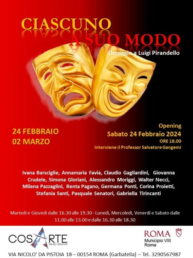 Dal 24 Febbraio al 02 Marzo 2024 si terrà la Mostra collettiva ‘Ciascuno a suo modo – Omaggio a Luigi Pirandello ’, con il patrocinio del Municipio Roma VIII, presso la galleria Cosarte nel cuore di Garbatella. La Mostra ‘Ciascuno a suo modo’ è un omaggio alla complessa poetica di Luigi Pirandello e intende evidenziare come ogni artista interpreta a suo modo la propria visione, il ‘proprio mondo di cose’ al confine tra realtà e finzione. Gli artisti espositori presenteranno la loro interpretazione del mondo pirandelliano, esplorando le diverse tematiche da lui affrontate, dove la vita è in continuo movimento e trasformazione. “Imparerai a tue spese che nel lungo tragitto della vita incontrerai tante maschere e pochi volti.” (Luigi Pirandello). Secondo Giovanni Calendoli «Ciascuno a suo modo propone il gioco dell'infinito rapporto che si stabilisce tra la realtà e la rappresentazione, illustrando l'implacabile suggestione che la rappresentazione artistica esercita sulla realtà, plasmandola a sua somiglianza». Opening Sabato 24 febbraio 2024 dalle ore 18.00. Interviene il Professore Salvatore Gangemi Info mostra: Orari: Martedì e Giovedì dalle 16.30 alle 19.00 - Lunedì, Mercoledì, Venerdì e Sabato dalle 11.00 alle 13.00 e dalle 16.30 alle 18.30 Ingresso libero COSARTE Spazio Creativo Via Nicolò da Pistoia, 18 – Roma (Garbatella) Contatti: Tel. 3290567987 (Simona Gloriani) – 06/64010660 Email: cosarte@libero.it - Pagina Facebook: Cosarte Spazio Creativo