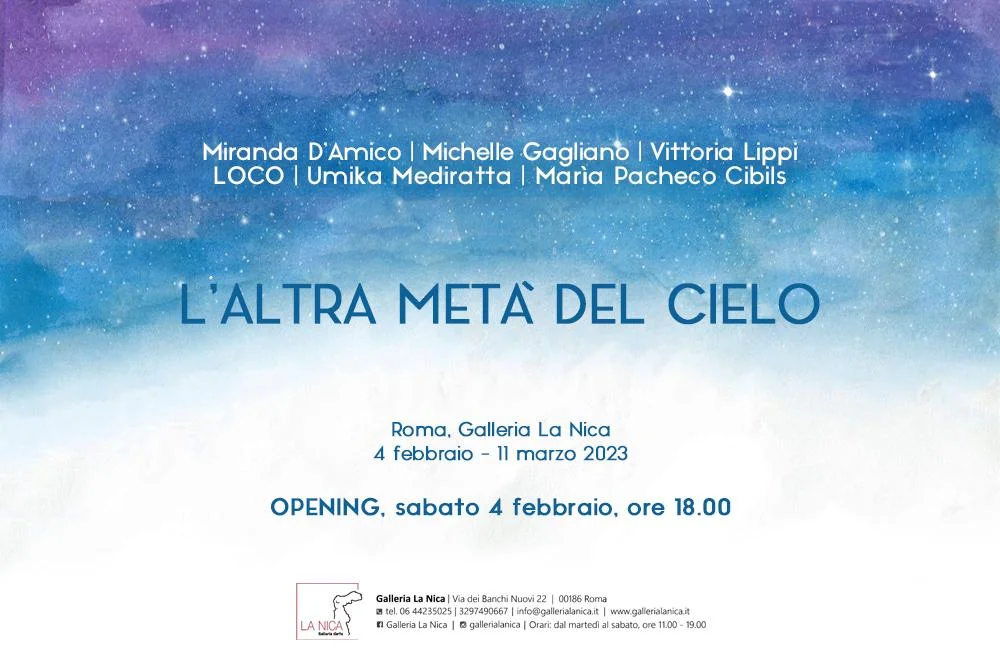 Sabato 4 febbraio 2023 alle ore 18.00 verrà inaugurata alla Galleria La Nica di Roma, sita in via dei Banchi Nuovi 22, la mostra collettiva "L’ALTRA METÀ DEL CIELO", che presenterà al pubblico il lavoro di 6 artiste con cui La Nica è venuta a contatto nel corso degli ultimi tempi: Miranda D’Amico, Michelle Gagliano, Vittoria Lippi, LOCO, Umika Mediratta e Marìa Pacheco Cibils. Di nazionalità e culture differenti e con ricerche artistiche ben delineate, queste artiste condividono altresì una relazione intima e personale con il mondo naturale che, in una chiave spiccatamente femminile, è protagonista della loro arte. Il titolo della mostra, volutamente ispirato ad un antico proverbio cinese che recita “Le donne sostengono l’altra metà del cielo”, vuole portare il fruitore a riflettere su un’affermazione sicuramente metaforica che, sintetizzando la complementarietà tra il femminile ed il maschile, sottolinea la forza generatrice delle donne in un mondo, quello dell’arte, che solamente negli ultimi decenni ha cominciato a dar loro il giusto riconoscimento. Da sempre legato alla terra ed ai suoi ritmi e cicli, il corpo della donna le insegna fin da fanciulla a comprendere – dal latino, prendere con – ed assecondare i processi della natura. Quest’ultimo concetto è il punto di partenza di una riflessione più ampia sulla necessità che queste artiste hanno avvertito di tornare in comunione con la forza generatrice femminile per lasciar fluire liberamente le proprie energie creative secondo i ritmi immutabili del mondo naturale. Non sorprende, dunque, il sottile fil rouge che lega la sensibilità ed il lavoro di queste 6 artiste, delle quali sia il percorso e sia gli esiti sono tutt’altro che simili. La mostra presenterà opere eterogenee, tra pittura e scultura, che daranno uno spaccato della produzione artistica di ciascuna delle diverse protagoniste con le quali la Galleria La Nica intende proseguire o cominciare un dialogo che perduri nel tempo. “L’ALTRA METÀ DEL CIELO” sarà inaugurata sabato 4 febbraio 2023 alle ore 18.00 e sarà fruibile fino all’11 marzo 2023.