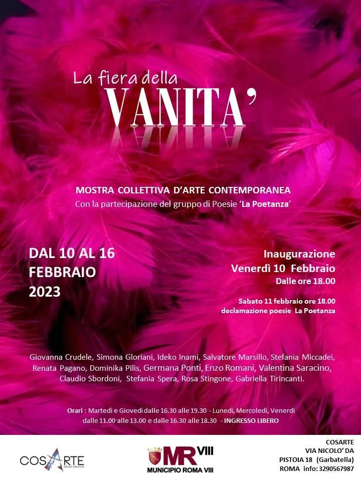 Dal 10 al 16 febbraio 2023 si terrà la Mostra collettiva ‘La Fiera della VANITA’’, con il patrocinio del Municipio Roma VIII, presso la galleria Cosarte nel cuore di Garbatella. Gli artisti sono stati chiamati ad interpretare il concetto di Vanità per mettere in risalto le diverse sfaccettature di questo comportamento umano dalle sembianze futili ed egocentriche. Se nella sua origine il termine ‘vanitas’ si riferisce al ‘vuoto’ (dal latino vanus), vano, vuoto, privo di consistenza e di sostanza, richiamando un genere artistico seicentesco di natura morta che doveva simboleggiare l'idea che l'esistenza è vuota, inutile, precaria, il termine nel tempo ha assunto diverse accezioni. I vari aspetti della vanità mostrano ad esempio la futilità intesa come frivolezza, superficialità, fino ad arrivare al puerile compiacimento di sé, al narcisismo o alla connotazione filosofica che rimanda ad un senso di egoismo e di superbia. L’esposizione intende dare ampio respiro all’interpretazione del tema mettendo in risalto l’idea che la leggerezza non è sempre superficialità e che l’arte ci può aiutare ad uscire fuori dalla ‘pesantezza’ della contemporaneità. Gustave Flaubert - L'orgoglio è una bestia feroce che vive nelle caverne e nei deserti; la vanità invece è un pappagallo che salta di ramo in ramo e chiacchiera in piena luce. La mostra si terrà dal 10 al 16 febbraio 2023 e vedrà la partecipazione del gruppo di poeti LA POETANZA. Vernissage venerdì 10 febbraio 2023 dalle ore 18.00. Sabato 11 febbraio ore 18.00 declamazioni di poesie della Poetanza. Artisti: Giovanna Crudele, Simona Gloriani, Ideko Inami, Salvatore Marsillo, Stefania Miccadei, Renata Pagano, Dominika Pilis, Germana Ponti, Enzo Romani, Valentina Saracino, Claudio Sbordoni, Stefania Spera, Rosa Stingone, Gabriella Tirincanti. Info mostra: Orari: Martedì e Giovedì dalle 16.30 alle 19.00 - Lunedì, Mercoledì, Venerdì dalle 11.00 alle 13.00 e dalle 16.30 alle 18.30 Ingresso libero COSARTE Spazio Creativo Via Nicolò da Pistoia, 18 – Roma (Garbatella) Contatti: Tel. 3290567987 (Simona Gloriani) – 06/64010660 Email: cosarte@libero.it - Pagina Facebook: Cosarte Spazio Creativo