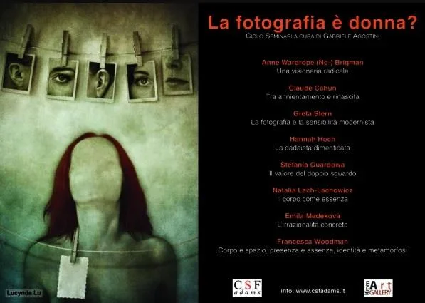 Inauguriamo il nuovo anno con un ciclo di seminari aperti a tutti gli iscritti dell’anno 2022 e i futuri iscritti del 2023. La fotografia è donna? a cura di Gabriele Agostini I seminari s svolgeranno una volta al mese. Il primo seminario si terrà Venerdì 20 gennaio 2022 alle ore 19:30 Francesca Woodman La fotografia fra sovrapposizioni e duplicazioni I prossimi seminari in programmazione Anne Wardrope (No-) Brigman Una visionaria radicale Claude Cahun Tra annientamento e rinascita Greta Stern La fotografia e la sensibilità modernista Hannah Hoch La dadaista dimenticata Stefania Guardowa Il valore del doppio sguardo Natalia Lach-Lachowicz Il corpo come essenza Emila Medekovà L’irrazionalità concreta Per partecipare ai seminari basta essere in regola con l’iscrizione annuale Info@csfadams.it fotografia di Lucinda Lu