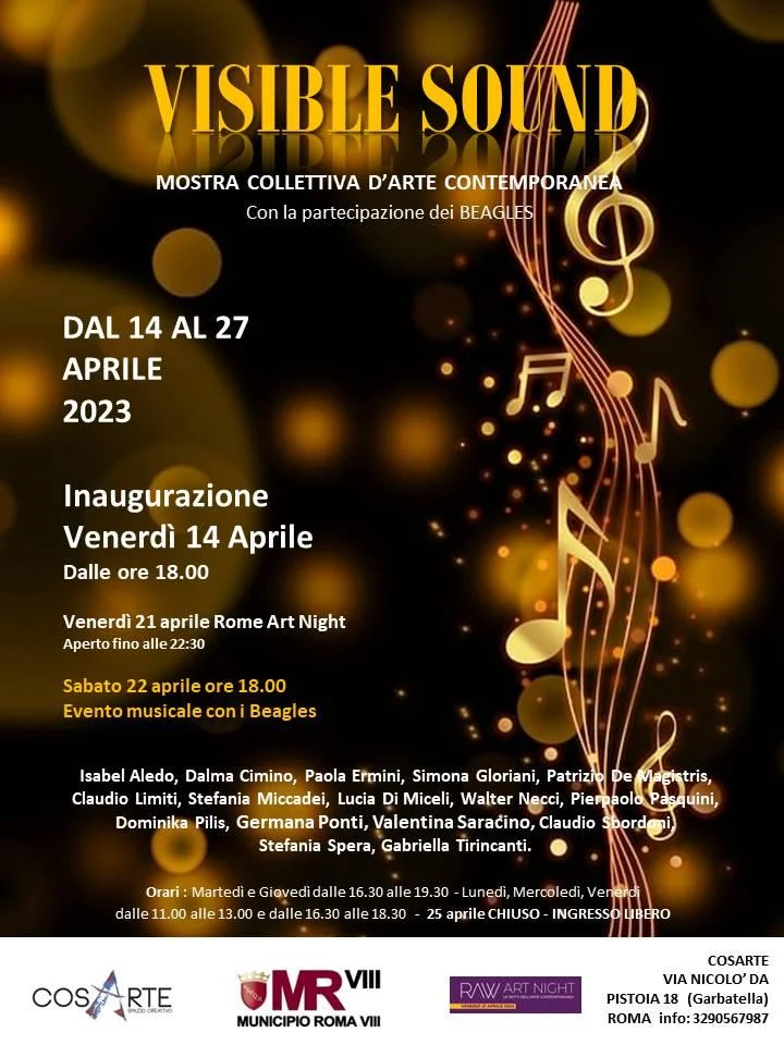 Dal 14 al 27 aprile 2023 si terrà la Mostra collettiva ‘Visible Sound’’, con il patrocinio del Municipio Roma VIII, presso la galleria Cosarte nel cuore di Garbatella. La musica è da sempre una musa ispiratrice per l’arte. Nella storia abbiamo esempi importanti dell’incontro tra queste due sfere espressive, pensiamo solo a Kandinsky, ma anche Braque e Picasso o i Musici di Caravaggio. ‘Visible Sound’ è un progetto culturale che vuole mettere in parallelo l’arte della musica con le arti visive, mettere in relazione arte e suoni, colori ed emozioni, gesti creativi e note musicali. La mostra è un viaggio tra stili differenti, dove i colori, le forme, le immagini sono come strumenti musicali che creano una sinfonia, risvegliando le nostre facoltà immaginative. Nello spazio espositivo si cercherà di evidenziare le infinite, interazioni tra elementi musicali e arti visive. Durante la mostra si terrà anche un piccolo evento musicale ad opera del gruppo i BEAGLES, proponendo modelli significativi di entrambe le arti, creando così uno spettacolo di grande attrazione. I Beagles sono un gruppo romano che si può definire ''storico'', essendosi costituito nel 2003. Formazione classica, due chitarre, basso e batteria, ma i componenti del gruppo (ognuno dei quali vanta un'esperienza in campo musicale di oltre 40 anni) sono tutti polistrumentisti. Il loro repertorio si basa sul ''classic rock'' anglosassone, con particolare riferimento agli anni '60 e '70. La mostra di arte contemporanea presenta il lavoro di 16 artisti di grande talento, che portano la loro visione della musica attraverso diverse discipline, pittura, pitto-scultura, fotografia e fumetto. Ogni artista interpreta con la sua visione ed il suo stile (figurativo, astratto o informale) le proprie emozioni, traducendo l’invisibile in visibile; visible sound. Durante l’esposizione la Galleria Cosarte parteciperà inoltre a Rome Art Night il 21 aprile 2023 e lo spazio espositivo sarà eccezionalmente aperto fino alle 22:30. Artisti: Isabel Aledo, Dalma Cimino, Paola Ermini, Simona Gloriani, Patrizio De Magistris, Claudio Limiti, Stefania Miccadei, Lucia Di Miceli, Walter Necci, Pierpaolo Pasquini, Dominika Pilis, Germana Ponti, Valentina Saracino, Claudio Sbordoni, Stefania Spera, Gabriella Tirincanti. Vernissage venerdì 14 aprile 2023 dalle ore 18.00. Venerdì 21 aprile Rome Art Night la Galleria aperta fino alle 22.30 Sabato 22 aprile ore 18.00 evento musicale con i Beagles. Info mostra: Orari: Martedì e Giovedì dalle 16.30 alle 19.00 - Lunedì, Mercoledì, Venerdì dalle 11.00 alle 13.00 e dalle 16.30 alle 18.30 - 25 aprile Chiuso Ingresso libero COSARTE Spazio Creativo Via Nicolò da Pistoia, 18 – Roma (Garbatella) Contatti: Tel. 3290567987 (Simona Gloriani) – 06/64010660 Email: cosarte@libero.it - Pagina Facebook: Cosarte Spazio Creativo