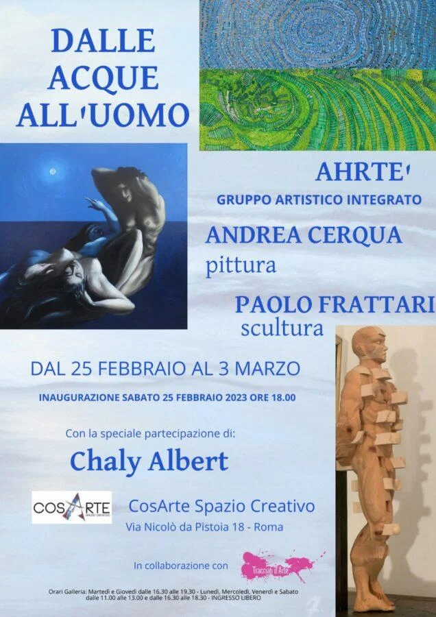 DALLE ACQUE ALL’UOMO Mostra d’Arte dal 25 Febbraio al 3 Marzo – Galleria CosArte via Nicolò da Pistoia 18 - Roma La mostra d’Arte Dalle Acque all’Uomo organizzata da Tracciati d’Arte nella galleria “CosArte” di Simona Gloriani in via Nicolò da Pistoia, è un unione di Pittura e Scultura all’insegna dell’integrazione di varie essenze umane. Il Gruppo Artistico Integrato della Solidarietà Società Cooperativa Sociale, Ahrtè fa opera di sensibilizzazione culturale prima che arte a sé stante, le sue opere sono frutto di una lunga disquisizione non solo sulle tematiche e le tecniche di realizzazione degli elaborati ma più specificatamente della loro contestualizzazione rispetto alle storie personali, agli eventi e mutamenti storici. Nessuno ha la supponenza di entrare nel dato critico ma di certo l’idea della compartecipazione progettuale sul tipo della Bauhaus tedesca, ovvero condivisione, ha trovato il gruppo d’accordo fin dal primo momento. Per risolvere l’assillo però della mediazione tra l’idea dell’artista diversamente abile e le reali possibilità di realizzazione di ogni ragazzo, la Cooperativa si è reinventata il ruolo di “Facilitatore artistico”, ovvero colui che guida e stimola gli artisti per dar vita a qualcosa che diversamente diventerebbe improbabile. Un gesto ed il pensiero primitivo possono essere più significativi ed espressivi di tanti leziosi accademismi, questo per Ahrtè è facilità comunicativa. La passione per l’arte di Andrea Cerqua risale alla sua giovinezza, quando ha iniziato a sperimentare diverse tecniche pittoriche e ha cominciato a dipingere le opere che lo hanno reso noto. La sua formazione artistica ha avuto luogo presso l’Accademia di Belle Arti di Roma, dove ha studiato con alcuni dei più grandi artisti del tempo. Le opere di Cerqua sono caratterizzate da una grande attenzione ai dettagli e alla luce, elementi che conferiscono alle sue creazioni un grande realismo e una sensazione di vitalità. Utilizzando principalmente colori ad olio, Cerqua dipinge spaziando dalla metafisica al naturale, ritratti marine e nature morte, sempre con un occhio attento alla bellezza della natura e alla sua relazione con l’essere umano. Oltre alla sua attività di pittore, Cerqua è stato anche un attivo organizzatore di eventi culturali nella sua città, Ladispoli. Ha fondato l’associazione culturale “Fatto a Mano”, e la rivista “Tracciati d’Arte” che si occupa da decenni di promuovere l’arte e la cultura sul territorio della provincia di Roma, e ha organizzato numerose mostre d’arte ed eventi culturali in tutta Italia. Paolo Frattari studia i corpi, le loro forme, i loro dettagli e li scolpisce nel legno cercando di catturarne l’essenza. Da bambino giocava nelle antiche rovine etrusche cercando tesori, ora cerca tesori nel legno che scolpisce. Scultore per amore, per impellente desiderio, per necessità espressiva. Si muove all'interno dei corpi immedesimandosi con l'anatomia, la tocca la annusa, la reinventa facendo nascere nuove forme. La potenza di ogni colpo di scalpello libera i corpi imprigionati nella materia. Ogni nodo ogni ferita del legno diventa il nodo e la ferita dei corpi che vengono alla luce. Nel suo percorso creativo sperimenta altre forme espressive. Coniuga la precisione del falegname con la creatività dello scultore, segue le linee sinuose di sedie e tavoli creando così mobili concepiti come opere d’arte.