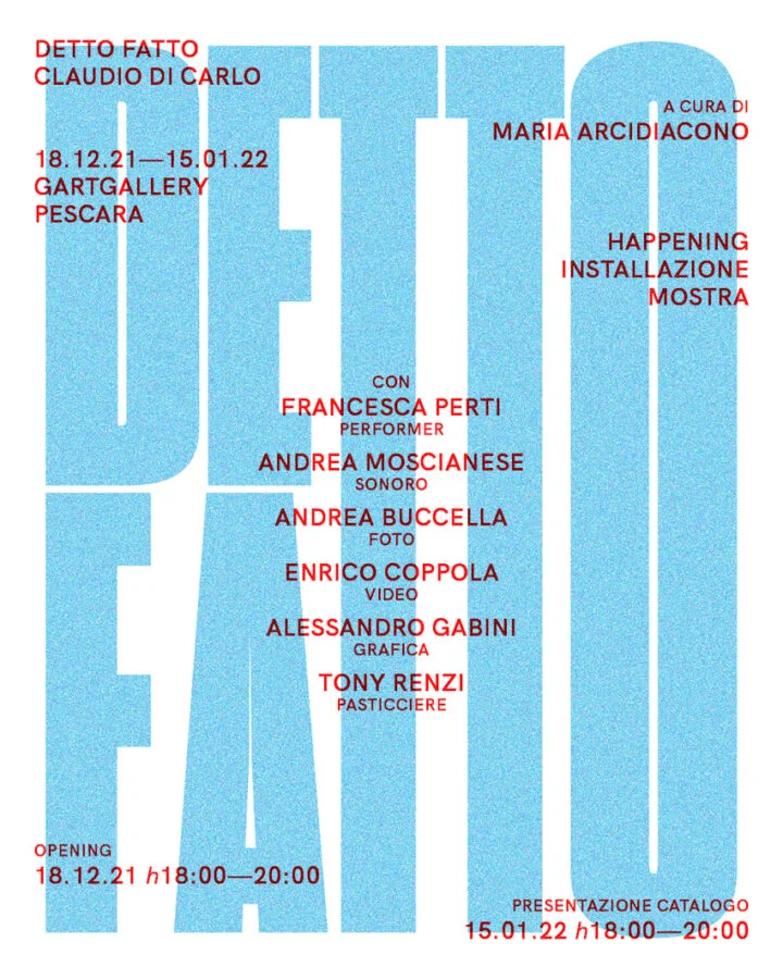 Claudio Di Carlo Detto Fatto mostra/installazione/happening a cura di Maria Arcidiacono Inaugurazione sabato 18 dicembre 2021 ore 18.00-21.00 GArt Gallery Via Piero Gobetti 114 - Pescara Fino al 15 gennaio 2022 In continuità con I pasticcini li porto io, mostra tenutasi a Roma nel 2020, Claudio Di Carlo, ospite del nuovo spazio espositivo pescarese GArt Gallery diretto da Francesco Di Matteo, presenta Detto Fatto, mostra/installazione/happening a cura di Maria Arcidiacono. Detto Fatto costituisce il secondo appuntamento di un ciclo che, in questa occasione, vedrà protagoniste ben novantanove opere sulle quali convergono molti dei temi che hanno attraversato il percorso creativo dell’artista, arricchiti da nuovi lavori ispirati a pellicole cinematografiche, alcune delle quali individuate con veri e propri intenti autobiografici. Il tutto servito sui classici vassoi da pasticcini, sapientemente trasformati in supporti solidissimi e parzialmente muniti della propria cornice dorata. Per volontà dell’artista, il pubblico si troverà partecipe di un vero e proprio happening orchestrato dallo stesso Di Carlo che predilige da sempre un coinvolgimento collettivo nei suoi progetti espositivi, musicali e culturali: dalle elaborazioni grafiche di Alessandro Gabini alla performance con Francesca Perti e Andrea Buccella, dal contributo di Andrea Moscianese, con una sua composizione, alle riprese video di Enrico Coppola, mentre spetterà al tocco artistico del pasticcere Tony Renzi apporre la classica - e non solo metaforica - ciliegina sulla torta. “Capolavori e divi della settima arte hanno invaso lo studio dell'artista, evocati a testimoniare narrazioni simili al reale, selezionati da un regista che ha conferito concretezza pittorica alla loro fragile evanescenza. Tra il luccichio di questi frammenti, trovano spazio quegli attimi ravvicinati di un erotismo svelato e sotteso, dettagli di una sensualità sfrontata, ingigantita e venerata, mentre un autoritratto su tela, il centesimo lavoro in mostra, emerge dal passato, quasi a vigilare sul mantenimento di propositi mai dimenticati che troveranno un'eco nella performance inaugurale. Rinsaldando la propria libertà d'artista, il suo essere viaggiatore instancabile e curioso - anche quando si è fermato stabilmente in una delle città nelle quali ha abitato - Claudio Di Carlo ci apre le porte su un immaginario senza tempo, ricco di latitudini sconosciute con le quali ci invita a familiarizzare. Il suo paesaggio politico percorre un'ampia parabola che va dall'ideale libertario alla realpolitik del tempo presente, con uno sguardo fieramente privo di conformismi e condizionamenti che vuole mantenere viva la propria indipendenza militante.” (dal testo di Maria Arcidiacono) Sabato 15 gennaio 2022 alle ore 18:00, in occasione del finissage, verrà presentato il catalogo della mostra che conterrà anche un contributo di Germano Scurti. Claudio Di Carlo nasce a Pescara: pittore, produttore, art director, vive e lavora tra Amburgo, Pescara e Roma. La sua vita d’artista, di natura poliedrica, inizia a Pescara, negli anni ’70, e si dirama fra la comune di Ovada e le strade d’Europa. Arte, politica e poetica sono le sue linee guida: indipendente per vocazione. Punto di riferimento artistico la galleria “Convergenze” a Pescara diretta da Peppino D’Emilio, Claudio Di Carlo ha sempre posto il proprio sguardo sulle forme dello sconfinamento. È un artista proteiforme che ha attraversato la pluralità delle esperienze controculturali e artistiche degli anni Settanta e Ottanta. Cresciuto nell’humus dell’anarchismo etico-politico, si è occupato di musica underground e di teatro di ricerca. Ha progettato spazi culturali, creato gruppi di intervento artistici, spettacoli multimediali, prodotto gruppi rap/rock, inventato e organizzato Festival, happening e performance; si occupa anche di musica elettronica. Il suo lavoro spazia, dunque, dalla fondazione dei gruppi Punk-rock Koma e R.A.F. (Frazione Armata Rock) nel 1977 al suo recente “Omaggio a Rossini - Già la luna è in mezzo al mare”, lavoro esposto a Pesaro in Casa Rossini, alla musica elettronica del suo attuale gruppo “Hypervectorial System”, con il compositore Gabriel Maldonado. Le sue opere sono presenti in collezioni pubbliche e private in tutto il mondo e diversi sono i critici che seguono il suo lavoro. Dopo l’esperienza romana dell’Ice Badile Studio con 11 anni condivisi con gli artisti Daniela Papadia, Emilio Leofreddi, Andrea Orsini, Ivan Barlafante, torna a sperimentare la sopravvivenza dell’essere senza uno studio, fino al 2020 dove apre il kKstudio a Pescara. INFO Claudio Di Carlo Detto Fatto mostra/installazione/happening A cura di Maria Arcidiacono Con: Andrea Buccella, Enrico Coppola, Francesco Di Matteo, Alessandro Gabini, Andrea Moscianese, Francesca Perti, Tony Renzi Inaugurazione sabato 18 dicembre 2021 ore 18.00-21.00 GArt Gallery Via Piero Gobetti 114 - Pescara Tel. +39 349 7913885 info@gartgallery.it www.gartgallery.it Fino al 15 gennaio 2022 Orari: dal lunedì al sabato ore 17:30-20:00