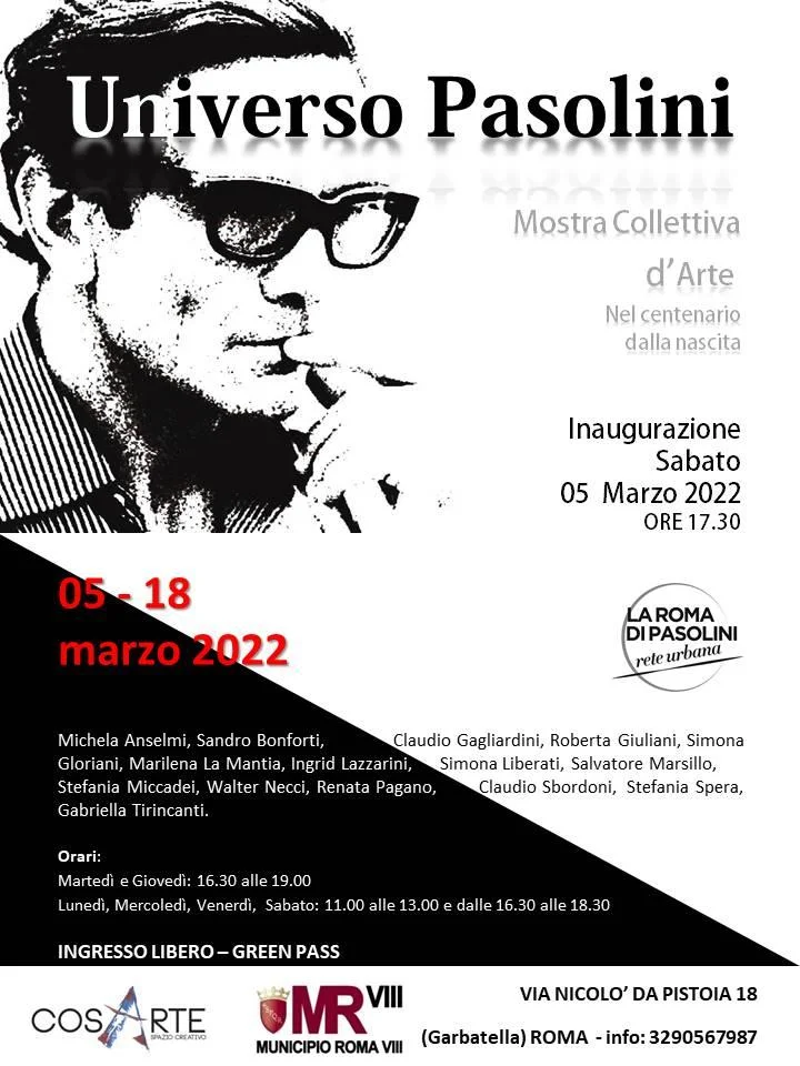 In occasione del centenario dalla nascita di Pier Paolo Pasolini, la Galleria Cosarte intende rendere omaggio al grande artista ed intellettuale del XX secolo, con una mostra collettiva dal titolo ‘Universo Pasolini’. L’esposizione si terrà dal 05 al 18 marzo 2022 presso Cosarte Spazio Creativo nel cuore di Garbatella, con la collaborazione del Municipio Roma VIII e inserita in un progetto, La Roma di Pasolini - Rete Urbana, con una serie di eventi culturali nel quartiere e in tutto il comune di Roma per l’anno Pasoliniano.