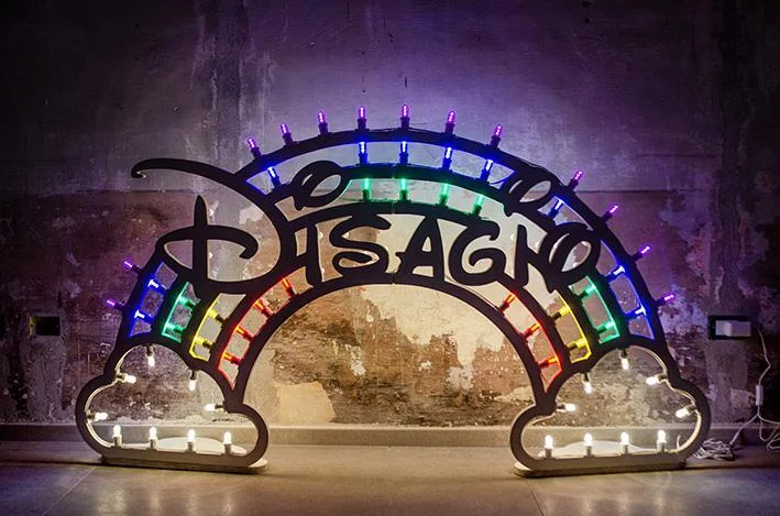 Tra tradizione popolare ed estetica neo-pop, a metà strada tra il Salento e Las Vegas, la galleria Area\B di Milano presenta, dall’8 novembre 2019 al 16 gennaio 2020, le installazioni luminose di David Cesaria (Mesagne (BR), 1976 – vive e lavora a Taranto) nella mostra personale “Jackpop”. Partendo dalla tradizione delle luminarie salentine – da cui Cesaria trae la tecnica, ma anche le atmosfere gioiose – le dodici opere esposte approdano a un immaginario fatto di animali fantastici, gesti scaramantici, superstizioni popolari che restituiscono l’immagine di un uomo all’impegnativa ricerca di un equilibrio tra “filia” e “patia” – come sottolinea il curatore Igor Zanti –, tra piacere e dolore. Dalla contrapposizione tra yin e yang a quella tra eros e thanatos, da Oriente a Occidente, la storia dell’uomo è una storia di opposti. La continua tensione tra cielo e terra, e l’incapacità dell’essere umano di raggiungere una stabilità tra questi due estremi, ha fatto in modo che si sviluppassero pratiche o azioni che cercassero di avvicinare umano e divino. La luce ha assunto sin dai tempi più antichi – si pensi al culto del sole degli Egizi – il valore metaforico di rappresentazione della divinità. Anche oggi, nella tradizione contemporanea della pittura monocroma, l’essenza stessa del colore, la luce per l’appunto, diviene metafora del divino. Le luminarie tipiche del Sud Italia attingono allo stesso bacino semantico: anche in quel caso la luce è simbolo di mediazione tra umano e divino, nella sua accezione festosa ed effimera. A tal proposito, nel testo che accompagna la mostra, il curatore scrive: “Questi apparati, queste “parazioni” – come vengono definite nel dialetto salentino – sono celebrazione e tributo dell’umano alla dimensione divina. Non sorprende, di conseguenza, che David Cesaria, artista di origini pugliesi, abbia trovato la sua cifra stilistica e creativa proprio ispirandosi alla tradizione delle parazioni”. Rimanendo sul sottile confine che separa ma unisce il piacere e il suo opposto, Cesaria veste l’inquietudine umana di colori sgargianti e atmosfere chiassose che non possono però del tutto celare un vago senso di disagio. Le sue Slot-machine, le ironiche Influencer e Disagio, solo per citare alcune delle opere in mostra, per quanto appaiano giocose e leggere, affrontano temi che toccano molti aspetti dell’incertezza del vivere.