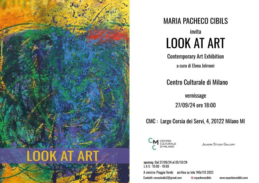 Maria Pacheco Cibils in mostra a LOOK AT ART Contemporary Art Exhibition A cura di Elena Jelmoni Vernissage 27 settembre 2024 ore 18.00 Centro Culturale di Milano Largo Corsia dei Servi 4 - Milano Fino al 5 ottobre 2024 La designer e artista visiva argentino-portoghese Maria Pacheco Cibils sarà uno dei protagonisti di LOOK AT ART - Contemporary Art Exhibition, progetto promosso da Jelmoni Studio Gallery, a cura di Elena Jelmoni, che inaugura il giorno 27 settembre 2024 alle ore 18.00 presso il Centro Culturale di Milano. L'arte si serve di un efficace linguaggio non verbale: l’azione, immediatamente comunicativa, i cui codici si sono sviluppati nel tempo e che impiega particolari strumenti per rendere manifesto il significato delle immagini rappresentate. Questa esperienza quotidiana dell'immagine vissuta genera orizzonti visivi e mentali in cui è possibile interrogarsi sulle funzioni passate e attuali dell'arte per riconsiderare il suo potere seduttivo e ruolo culturale. Artisti provenienti da percorsi diversi e che utilizzano una pluralità di linguaggi espressivi affrontano queste tematiche in una serie di progetti individuali che si sviluppano come un percorso attraverso l'azione e la visione contemporanea. Le opere nascono dalla combinazione sperimentale di elementi e linguaggi diversi alla ricerca del punto di incontro tra leggerezza e complessità da cui avventurarsi nell'esplorazione delle geografie psicologiche, politiche e sociali della cultura contemporanea globalizzata. L'arte è un pretesto per indagare concetti chiave del nostro presente, quali l'identità, nazionalità, la democrazia, il potere, la libertà, la partecipazione e i cambiamenti sociali. Maria Pacheco Cibils presenta per l’occasione l’opera Pioggia Verde, appartenente all’ultima serie di lavori realizzati nel 2023. Come scrive la critica d’arte Francesca Barbi Marinetti: « Le opere di Maria ci trasportano in ambienti immaginari, e al contempo familiari, oltre una soglia che sfugge ogni definizione, in spazialità estese fatte di trasparenze, vortici cromatici, profondità, luminosità e straordinaria vitalità. Nella corrente dei paesaggi subacquei della pittura di Pacheco Cibils - in cui dominano i verdi, gli azzurri ed i blu con vortici o colonie vitali di arancioni, viola, gialli e rossi - l’osservatore è avvolto dalla suggestione di possibili scenari pre-mnemonici dei principi universali della vita che attendono d’essere recuperati. Pulsa un battito rigenerante che riconduce al pensiero orientale, in particolare il buddismo tantrico, per cui è la donna ad essere portatrice di energia cosmica e conoscenza.» Maria Pacheco Cibils è designer e artista visiva argentino-portoghese. Le sue opere spaziano tra architettura d’interni, scenografie, ambientazioni, design di oggetti d’arte, pittura ed installazione. Ha collaborato con prestigiose riviste, giornali e canali televisivi. Ha organizzato mostre di artisti e fotografi, spettacoli di teatro e danza contemporanea. Curatrice di diversi brand, ha sviluppato prototipi e grafica degli stessi in Argentina, Paraguay e Italia. Le sue ricerche artistiche sono incentrate su temi primordiali e archetipici, indagando i quattro elementi della natura, radice di tutte le cose immutabili ed eterne e dei processi di trasformazione dell’essere umano. Ha partecipato a numerose mostre personali e collettive in Spagna, Germania, Austria, USA, Croazia, Regno Unito e Italia. Vincitrice del Primo Premio di Pittura “Lorenzo il Magnifico” a Florence Biennale 2023. Attualmente vive e lavora tra l’Italia e l’Argentina. Tra le ultime mostre: 2024 Roma “AROUND ROME” International Art Exhibition. Arte Borgo Gallery. Biblioteca Angelica Galleria. A cura di Anna Isopo; 2024 Nazzano “CHIAMATA ALLE ARTI”. Museo del Fiume. A cura di Guido D’Angelo; 2024 Barcellona “PROSPETTIVA....FUTURO” Hub / Art. International Art Exhibition; 2024 Londra “TRANSPARENT AS A DRAGONFLY”. Bermondsey Project Space; 2024 Firenze “I AM YOU” Accademia delle Arti del Disegno. Exhibition of the winner of the XIV Florence Biennale; 2023 Firenze “I AM YOU” "La Biennale di Firenze" Fortezza da Basso. Primo Premio Pittura: “LORENZO IL MAGNIFICO”; 2023 Roma"RITORNO AL BLU” RAW.Biblioteca Angelica-Galleria Mostra Personale; 2023 Roma "TRANSPARENT AS A DRAGONFLY” International Art Exhibition.Arte Borgo Gallery; 2023 Duvrobnik Croazia "COLOURS OF LIFE" Palazzo Sponza; 2023 Venezia“FRAGILITY UNVAILED” Palazzo Pisani Revedin Personal Exhibition; 2023 Roma “L’ATRA META’ DEL CIELO ”. Galleria La Nica; 2022 Spain PROJECT PALMA 1.0 Casa del Arte de Palma de Mallorca.Illes Balears. A cura de Artbox Project; 2022 Roma”HUMUS" RAW Biblioteca Angelica Mostra Personale; 2022 Milano “MULTITUDE" Fondazione Luciana Matalon Mostra Personale; 2022 Mantova “SYNESTHESIA" Museo Francesco Gonzaga; 2021 Miami Beach.Florida (USA) Scope Miami Beach International Contemporay Art Fair; 2021 Austria. Art Innsbruck.International Kunstmesse; 2021 Roma "LUMINESCENZA" RAW - Biblioteca Angelica - Galleria. Mostra Personale; 2021 Nazzano (Lazio) "EMPATIA NATURA COMUNITA" - Riserva Naturale Tevere Farfa, Nazzano; 2021 Roma "TRAME CONTEMPORANEE"- Palazzo della Cancelleria Vaticana; 2020 Roma "IL TEMPO SOSPESO " RAW - Biblioteca Angelica - Galleria Mostra personale; 2019 Roma "DIMENSIONI PARALLELE”RAW Biblioteca Angelica .Salone Monumentale. Installazione; 2017 Roma "FUOCO ETERNITA SAPERE".RAW:Biblioteca Angelica.Salone Monumentale. Installazione; 2017: Roma "FUOCO o della Rigenerazione" Biblioteca Angelica-Galleria. Mostra Personale. Il Centro Culturale di Milano è nato nel 1981. Ai suoi inizi prese nome di "Centro Culturale San Carlo", avendo la sua prima sede in corso Matteotti, presso la Basilica di San Carlo al Corso. Negli anni '80 la sua storia è segnata da figure e incontri come quelle di don Luigi Giussani (che lo ha originato e seguito negli anni), lo scrittore Gi