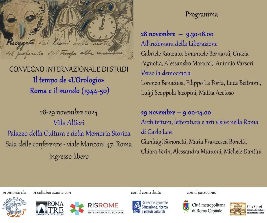 Nei giorni 28 e 29 novembre 2024, presso la Sala Conferenze di Villa Altieri - Palazzo della Cultura e della Memoria Storica, la Fondazione Carlo Levi presenta, in collaborazione con l'Università degli Studi Roma Tre e Rome International School, il Convegno Internazionale di Studi “Il tempo de «L’Orologio» - Roma e il mondo (1944-50)”.