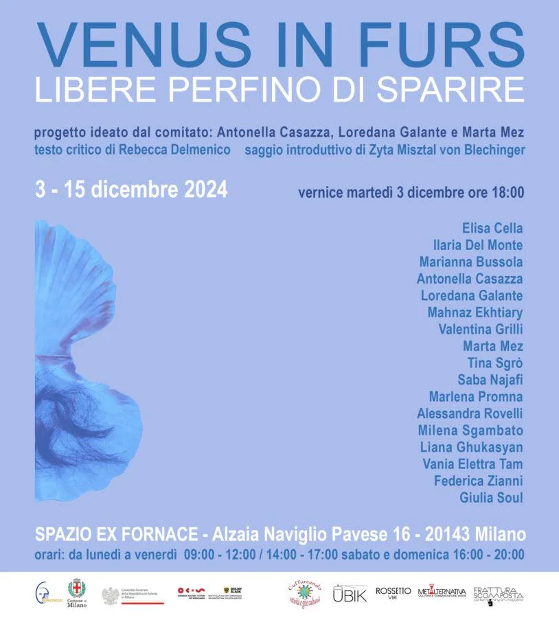 Titolo: Venus in furs – Libere perfino di sparire Organizzatori: Loredana Galante, Antonella Casazza, Marta Mez. Testo critico: Rebecca Delmenico Saggio introduttivo: Zyta Misztal von Blechinger Date: 3-15 dicembre 2024 Apertura: martedì 3 dicembre ore 09:00 Inaugurazione: martedì 3 dicembre ore 18:00 Sede: Spazio Ex Fornace - Alzaia Naviglio Pavese 16 – 202143 Milano Orari: lun.-ven. 09:00-12:00, 14:00-17:00; sab.-dom. 16:00-20:00 Recapiti Comitato Venus: 338 8834826 - 347 2250941 - 329 2129595 Mostra realizzata con la collaborazione di: CulTureando Attività e Gite Culturali; UBIK Associazione culturale. Patrocini: Municipio 6 – Comune di Milano; Consolato Generale della Repubblica di Polonia in Milano; Okis Centro di Cultura e Arte di Breslavia; Ministero della Cultura della Regione Dolny Śląsk in Polonia. Artiste: Marianna Bussola, Antonella Casazza, Elisa Cella, Mahnaz Ekhtiary, Ilaria Del Monte, Loredana Galante, Valentina Grilli, Liana Ghukasyan, Marta Mez, Saba Najafi, Marlena Promna, Alessandra Rovelli, Milena Sgambato, Tina Sgrò, Giulia Soul, Vania Elettra Tam, Federica Zianni. ____________________________________________________ L’esposizione VENUS IN FURS – LIBERE PERFINO DI SPARIRE propone un confronto diretto e personale sul tema della discriminazione di genere, dove la donna – libera “perfino di sparire” – è protagonista di una lotta per l’autodeterminazione e la rinascita. La mostra nasce dall’iniziativa delle artiste Loredana Galante, Antonella Casazza e Marta Mez, fondatrici del progetto espositivo Venus in Furs, nato all'inizio del 2024. Venus in Furs ha già realizzato quattro esposizioni e alcuni talk, con l'obiettivo di promuovere espressioni artistiche inclusive che esplorano il tema dell’identità femminile. In catalogo i testi di Rebecca Delmenico e Zyta Misztal von Blechinger costituiscono un’imprescindibile guida all’approfondimento delle opere e delle tematiche affrontate. Ognuna delle artiste coinvolte racconta, attraverso il proprio linguaggio visivo, un frammento di questa tematica. Marianna Bussola propone un’indagine del paesaggio per giungere alla definizione di una mitologia personale. Antonella Casazza presenta una riflessione viscerale sulla femminilità ferita tramite l’installazione “Non sento più il canto delle conchiglie”. Elisa Cella dipinge figure femminili intrappolate in giochi di linee, simbolo di desideri inappagati. Ilaria Del Monte esplora spazi metaforici di libertà e costrizione, come in “Le Spose Giovani”. Mahnaz Ekhtiary con l’opera “Outside is Inside” esplora il rapporto tra il mondo esterno e quello interiore. Loredana Galante, con il suo lavoro relazionale, esprime con grazia e ironia il valore della socialità e della connessione emotiva, mentre Liana Ghukasyan narra di storie irreali e oniriche mutuate da esperienze altrui e rese in modo caricaturale. Valentina Grilli esplora il concetto di presenza-assenza in scenari disabitati ma permeati di tracce di esistenza. La profondità della ricerca di Saba Najafi si esprime con la creazione di “pietre” a simboleggiare la persistenza della memoria, mentre Marta Mez dipinge atmosfere sospese che rimandano a paesaggi urbani, metafora di paure, angosce e incertezze. Marlena Promna esplora nel proprio lavoro il rapporto tra disegno e pittura nel contesto del piano e dello spazio mentre Alessandra Rovelli realizza paesaggi interiori affidati alla tridimensionalità delle sue Life-Box. Milena Sgambato, con delicatezza, dipinge figure sinuosamente fluide e libere nello spazio. Tina Sgrò ricrea atmosfere vibranti in cui sembra di poter afferrare tracce di invisibili presenze, Giulia Soul indaga il rapporto tra l’iper-connettività digitale e la paradossale disconnessione tra gli esseri umani. Vania Elettra Tam rende omaggio alla poliedricità femminile nella gestione delle battaglie quotidiane e Federica Zianni fonda la sua ricerca sul recupero dei miti classici, reinterpretando immagini archetipiche. Questo progetto sarà un’occasione per riflettere sul percorso di liberazione interiore e sociale delle donne, un viaggio che si esprime attraverso le metafore visive di artiste provenienti da contesti differenti. Martedì 3 dicembre a partire dalle 18.00 il brindisi inaugurale sarà offerto da Rossetti Vini.