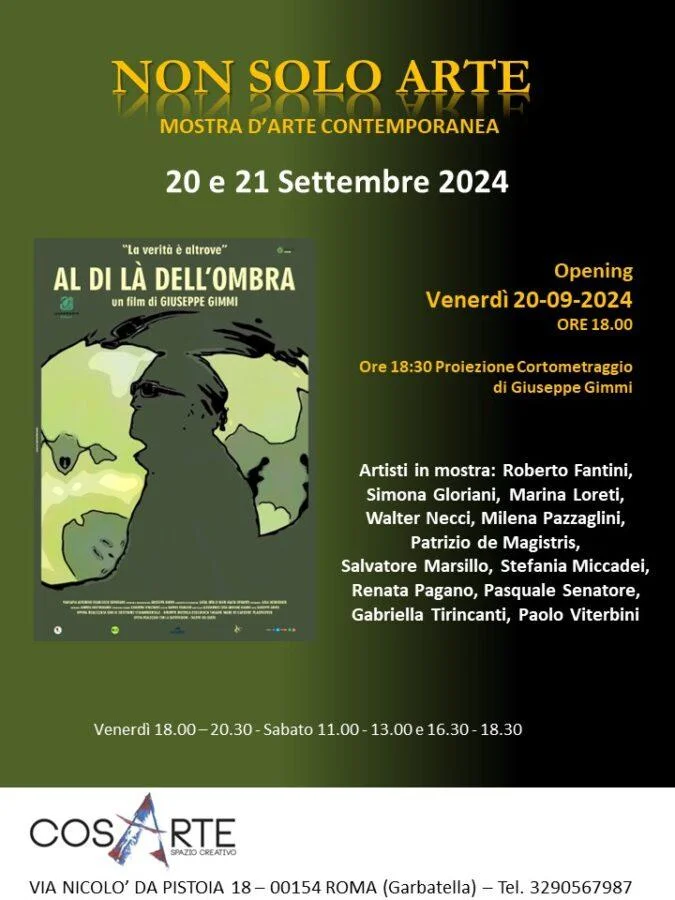 Il 20 e 21 Settembre 2024 si terrà l’esposizione collettiva ‘Non solo arte” presso la galleria Cosarte nel cuore di Garbatella. L’evento intende porre in evidenza le varie ‘potenzialità creative’ mettendo in connessione differenti arti, tecniche e personalità artistiche, in un connubio di sperimentazioni e visioni. Nell’esposizione si alterneranno due universi visivi. Una mostra di dodici artisti presenteranno le loro opere di arte contemporanea, confrontando tecniche, stili ed espressioni artistiche: : Roberto Fantini, Simona Gloriani, Marina Loreti, Walter Necci, Milena Pazzaglini, Patrizio de Magistris, Salvatore Marsillo, Stefania Miccadei, Renata Pagano, Pasquale Senatore, Gabriella Tirincanti, Paolo Viterbini. Un cortometraggio di Giuseppe Gimmi un giovane regista Pugliese che ha ricevuto importanti riconoscimenti, dando il via a un’attività cinematografica d’autore. Al di là dell’Ombra è un racconto intimo con sé stessi. L’idea è quella di raccontare un tempo lento, quasi sconosciuto a noi. Il ritmo incalzante della natura fa muovere il nostro protagonista, affetto da disabilità visiva, in un itinerario: la vita. Per il progetto un particolare ringraziamento al garante dei diritti delle persone con disabilita della regione Puglia Antonio Giampietro Opening Venerdì 20 Settembre 2024 dalle ore 18.00. Ore 18:30 Proiezione Cortometraggio di Giuseppe Gimmi Info mostra: Orari: Venerdì 18.00 – 20.30 - Sabato 11.00 - 13.00 e 16.30 - 18.30 Ingresso libero COSARTE Spazio Creativo Via Nicolò da Pistoia, 18 – Roma (Garbatella) Contatti: Tel. 3290567987 (Simona Gloriani) – 06/64010660 Email: cosarte@libero.it - Pagina Facebook: Cosarte Spazio Creativo