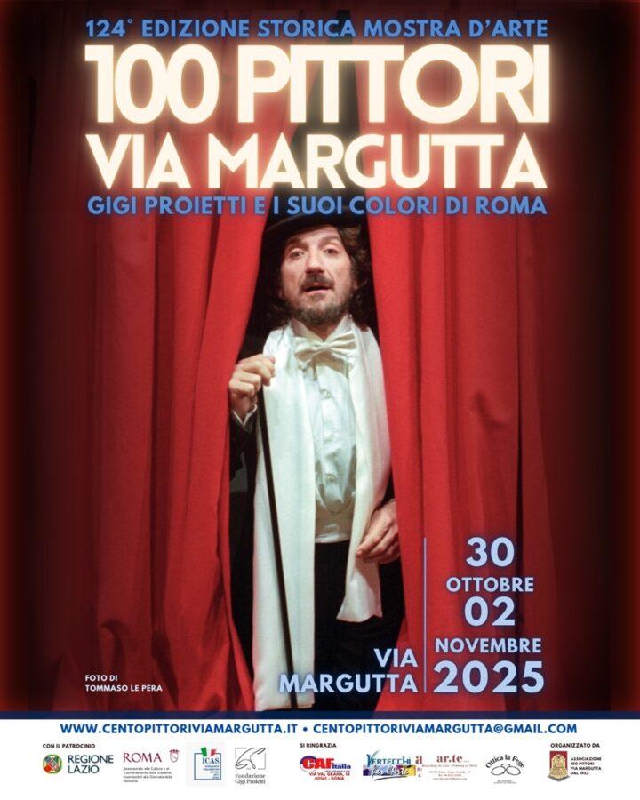 La storica manifestazione rende omaggio al grande Maestro nella sua Roma., città eterna dove storia, bellezza e creatività si intrecciano ad ogni angolo, ed è stata palcoscenico e fonte d’ispirazione per la genialità di uno dei più amati artisti italiani. Gigi Proietti, attore, autore, regista e poeta della romanità e nazionale, ha saputo raccontare l’anima di questa città come nessun altro: con ironia, profondità, passione e verità. Oggi, attraverso i colori, i pennelli e le tele degli Artisti di Via Margutta, Proietti torna idealmente tra le strade che lo hanno visto nascere, crescere e incantare. Questa mostra è un viaggio nella Roma che vive dentro di lui e che continua a vivere grazie a lui. Un tributo fatto d’arte e memoria, di luce e sentimento. Un omaggio al grande artista, eterno come la sua città.