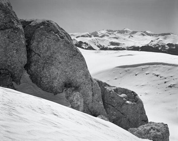 La ricerca di Giulio Speranza, fotografo paesaggista di montagna, docente di banco ottico e geologo, è caratterizzata da un approccio che prevede l’utilizzo dei banchi ottici di grande formato e delle pellicole bianco e nero: iniziata nel 2018 dal racconto del Gran Sasso d’Italia e proseguita con il progetto sulla Majella. Così racconta l’autore: «Dopo il progetto fotografico sul Gran Sasso, dominato dall’estetica grandiosa del massiccio abruzzese, seguito dalla ricerca sul rapporto tra l’uomo e la montagna, così come emerso da Majella Madre, eccomi infine giunto al terzo ed ultimo capitolo della trilogia: ho deciso di concludere il racconto della mia storia d’amore con l’Appennino Abruzzese tornando alle montagne della mia infanzia, il Velino-Sirente. Tornare quindi là dove è nato tutto per cercare di trovare la sintesi tra l’uomo e la montagna, ovvero raccontare me stesso e le mie emozioni attraverso quelle che sento essere le mie montagne, dove sono le radici più profonde della passione che mi spinge a fare quello che faccio oggi. Ho deciso di chiudere il cerchio andando sempre più in profondità dentro me stesso, per tirare fuori, grazie alla fotografia, l’essenza di quello che mi emoziona dell’essere sulle montagne. In altre parole, rispondere alla fondamentale domanda: “perché amo le montagne?”»