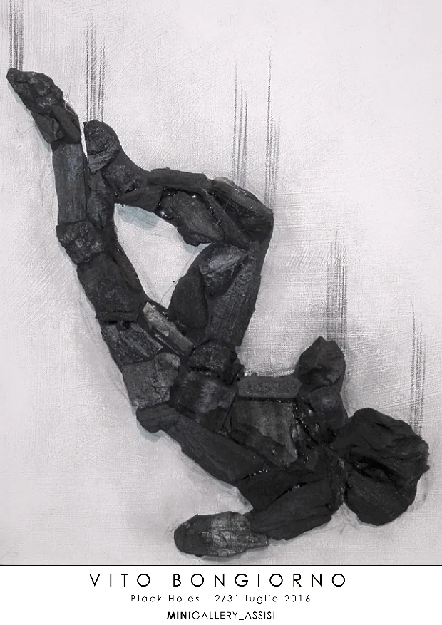 Presa di coscienza e conseguente denuncia dell’attuale stato di fragilità in cui si trova il nostro paese sono alla base delle profonde e significative opere che l’artista Vito Bongiorno (Alcamo 1963) sperimenta nell’ultimo decennio. Mediante l’uso di un elemento primordiale, oscuro ed inaridito come il carbone, egli riesce ad esprimere quell’inquinamento morale e sociale in cui sta precipitando il globo intero. Dopo la provocazione dell’opera “L’Italia brucia”, nella quale l’artista presenta una grande e fragile Italia di carbone a descrivere un paese oramai lacerato dalla crisi non solo economica ma soprattutto politico, culturale e sociale, Vito Bongiorno va oltre, superando i confini sensoriali dell’essere umano e preannunciando conseguenze quanto mai oscure. “Black holes”, la sua personale alla Minigallery di Assisi, è un avvertimento, una constatazione, è un’esortazione a non lasciarci inghiottire da quei buchi neri che la società contemporanea sta edificando giorno dopo giorno con la sua ragnatela di corruzione e mala azione. Presagi e segnali di tanta contaminazione sono ovunque e in ogni dove, si mostrano agli occhi dello spettatore in infinite ed oscure traiettorie cosparse da scorie di carbone. Immediata è la necessità di un ritorno alla purezza primordiale, bruciando la realtà che assedia la vita umana per non essere inghiottiti dal vuoto di una sterile esistenza.