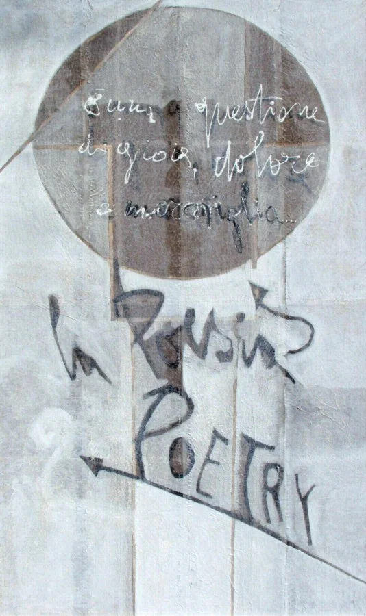 Il leitmotiv del ciclo delle Scritture è la lapidaria chiarezza della parola. Epigrafi contemporanee, le opere si annodano in questa suite come i versi di una lirica esistenziale, come le frasi musicali di un poema sinfonico, come gli aloni segreti di quadri rimossi da vecchie pareti, come polaroid vivide che fermano per sempre attimi che, se sbiadiscono sulla carta emulsionata, restano indelebili nella nostra pertinace memoria. La valenza significativa di un’opera come My poetry è paradigmatica: “La poesia è una questione di gioia, dolore e meraviglia”. La chiarezza programmatica esposta in forma di aforisma è caratteristica dei lavori dell’artista ed è tale da non lasciare spazio a fraintendimenti né, per certi aspetti, alle interpretazioni critiche. In queste grandi tecniche miste marcata è la prospettiva te(le)ologica del messaggio. Quasi un’architettura profonda è sottesa agli equilibri leggeri eppur solidi della composizione. Le tonalità di grigio comprese tra il chiaro e lo scuro assumono un valore del tutto originale. È qui che gli occhi dell’artista si distinguono da quelli degli altri: essi guardano nella profondità della materia come in quella dello spirito. Il tema centrale è quello dell’esistenza, che lambisce l’anima individuale e la memoria collettiva e si configura come una ieratica confessione. La simbologia pare quasi alchemica, ma è piuttosto la scelta di una geometria sacra e primordiale. L’aspetto decorativo non prevale ma non si dissolve, anzi permea profondamente di sé il concetto, che prende vita come un organo nuovo, biologico e musicale ad un tempo.